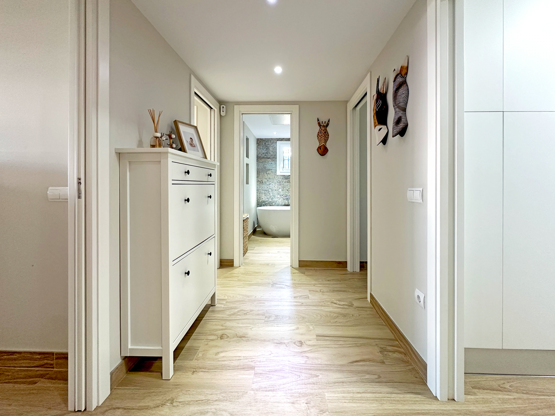 La vivienda cuenta con una superficie construida de 106,9 m² y un interior de 89 m², distribuidos en dos amplios dormitorios y dos modernos baños, uno de ellos en suite. El salón, luminoso y acogedor, se abre a una impresionante terraza privada de 120 m², perfecta para disfrutar de reuniones al aire libre, gracias a su zona de barbacoa y sus vistas panorámicas al campo, la montaña y los jardines comunitarios. La cocina, completamente equipada y renovada, se complementa con un práctico lavadero, mientras que los suelos de porcelana, la carpintería exterior e interior de alta calidad y los baños actualizados refuerzan la sensación de modernidad. La vivienda, en excelente estado y adaptada para personas con movilidad reducida, dispone además de aire acondicionado, chimenea, armarios empotrados y aseo de cortesía.
