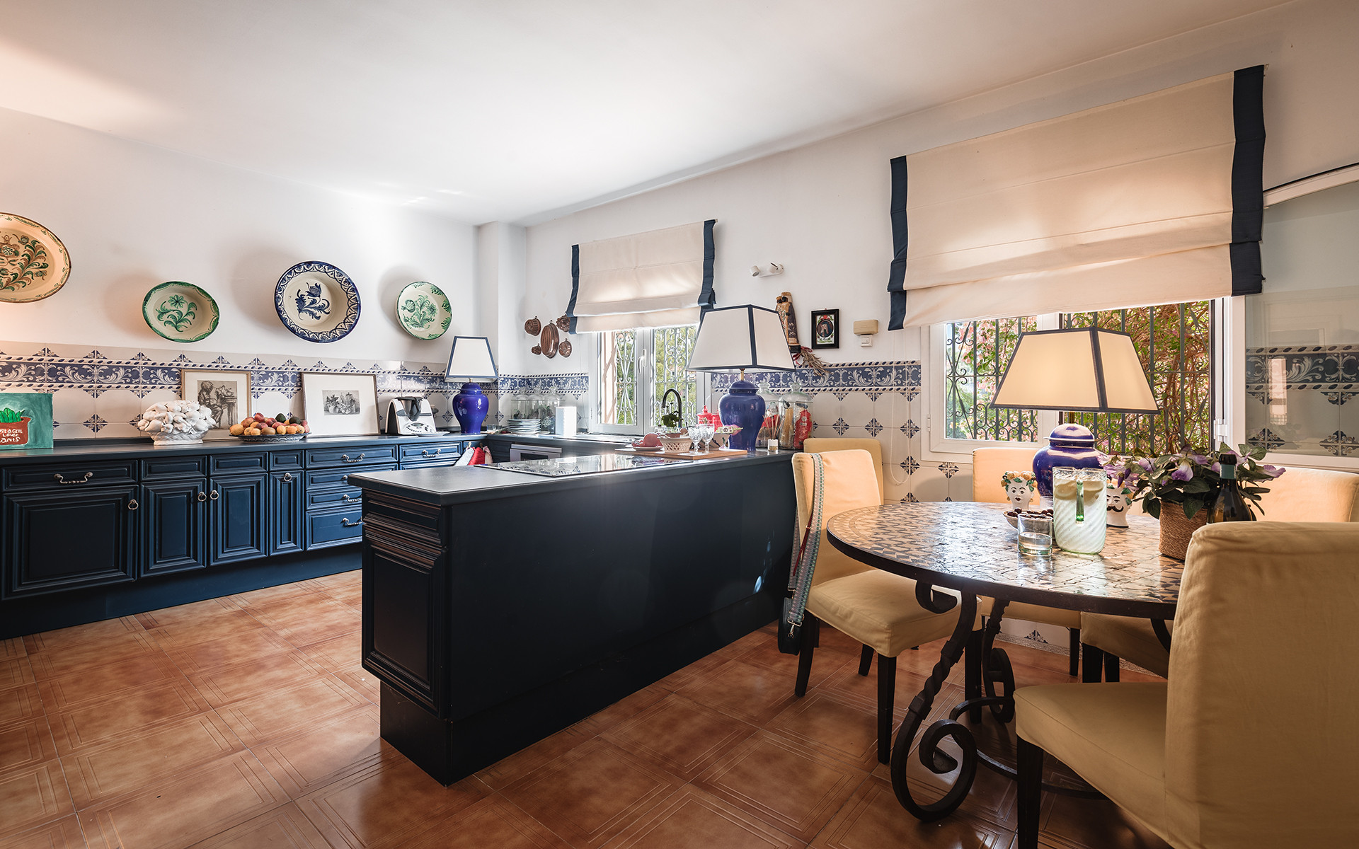 Un pintoresco patio andaluz con una fuente central le da la bienvenida a la vivienda, creando una atmósfera cálida y acogedora desde el primer momento. En el interior, la villa se abre a una amplia zona de estar con techos altos a dos aguas, cuidadosamente dividida en varios ambientes: un acogedor salón con chimenea, un comedor formal y un encantador rincón de música o lectura presidido por un piano.