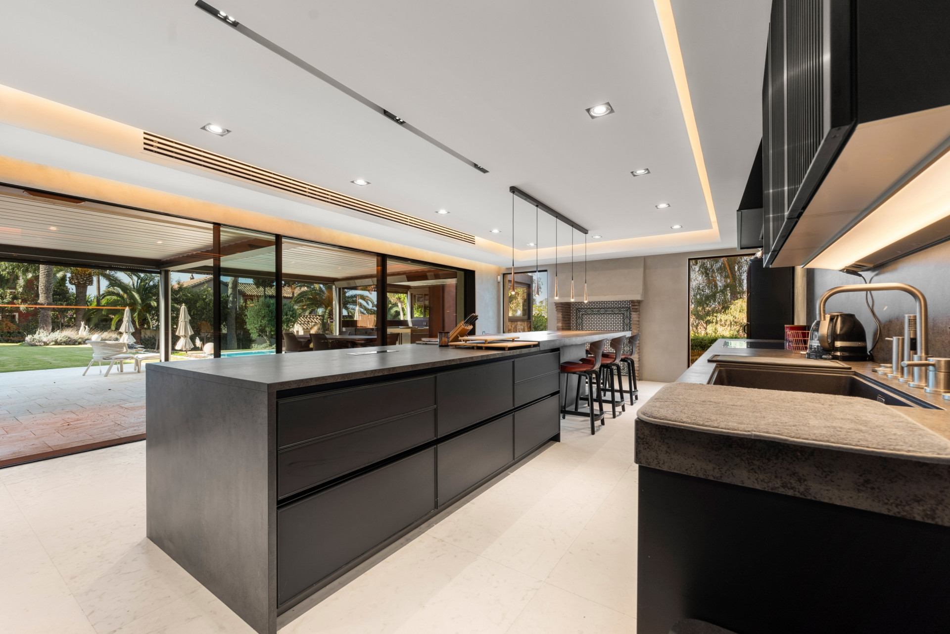 Renovated villa built to the highest standard with no expense spared on materials and equipment. It features 6 very comfortable en-suite bedrooms, including a separate guest house and a guest bedroom located on the top floor, with a separate entrance. There is a garage for two cars and a carport for six cars on a plot of over 2,000 m2. The large, open living and sitting areas include a kitchen outfitted with top-of-the-line Gaggenau appliances and wine fridges. The centrepiece of the kitchen is a long table with seating for ten and a large fireplace. The villa also boasts a children’s playroom, an office, an impressive professional restaurant-style outdoor kitchen, surrounded by cosy chill-out areas next to the heated pool and Jacuzzi, as well as a well-equipped gym. Off the entrance is a built-in security house.