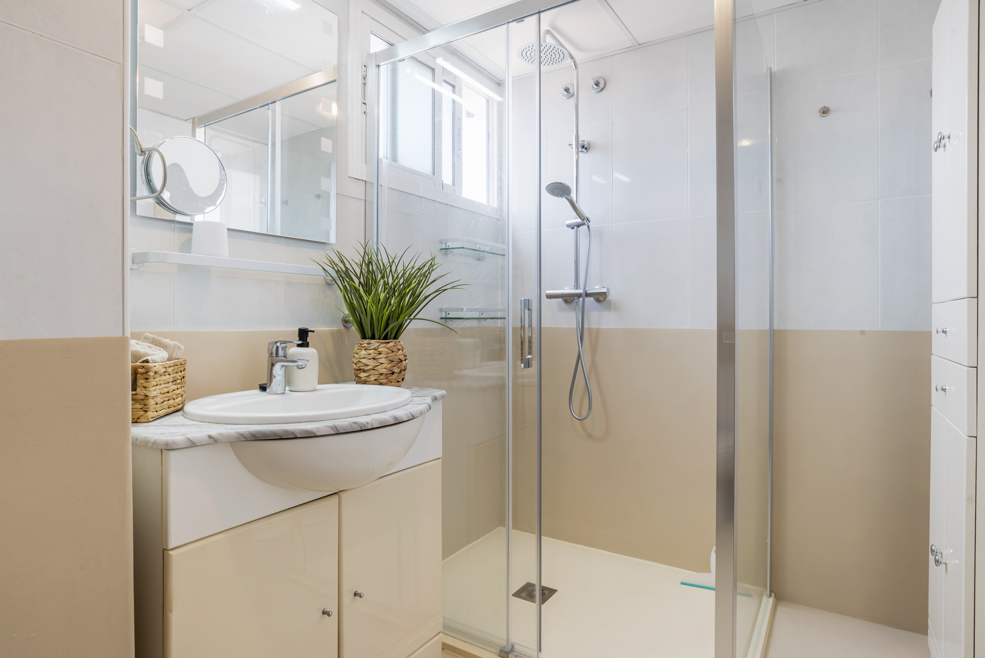 Designed for both comfort and practicality, the apartment features two generously proportioned bedrooms and two modern bathrooms, complemented by a bright and inviting living area that flows seamlessly onto a glass-enclosed terrace. This creates a versatile space to enjoy throughout the year, whether for relaxed mornings or evening gatherings.