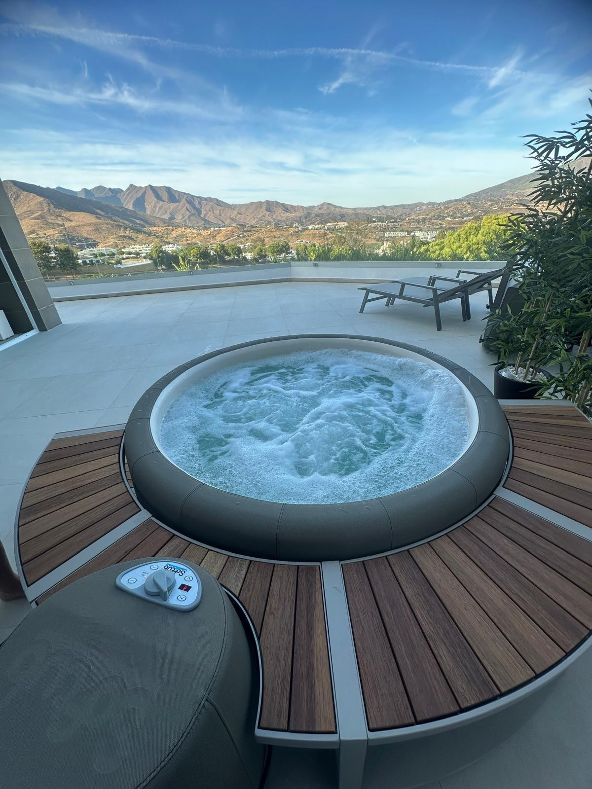 The master bedroom enjoys an en-suite bathroom and direct access to the terrace and jacuzzi area.