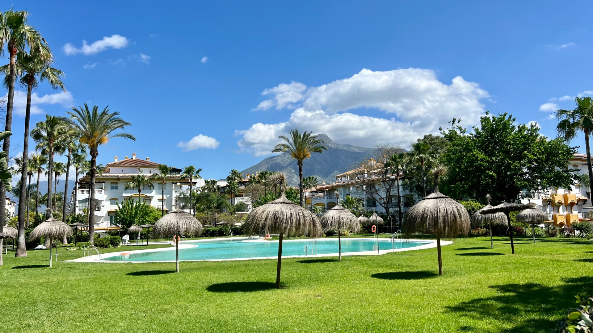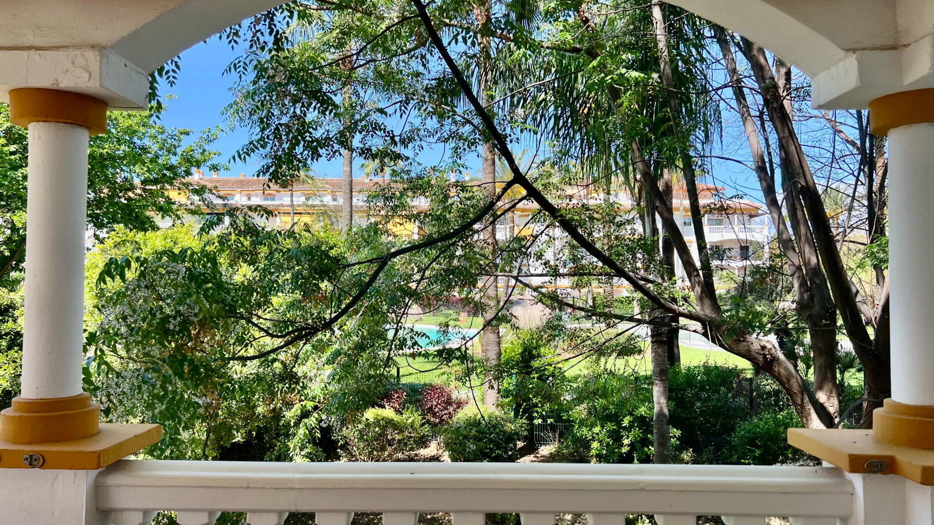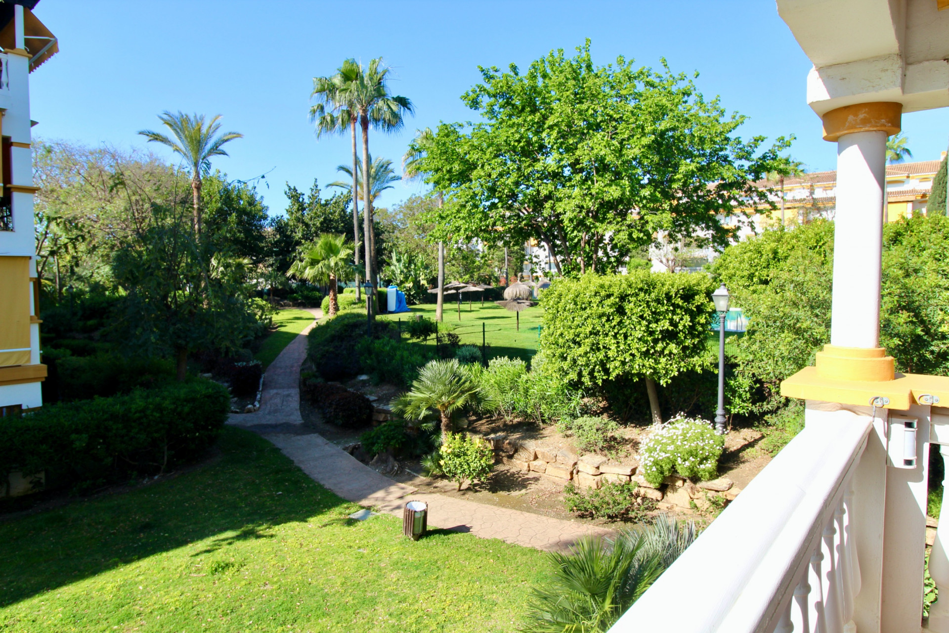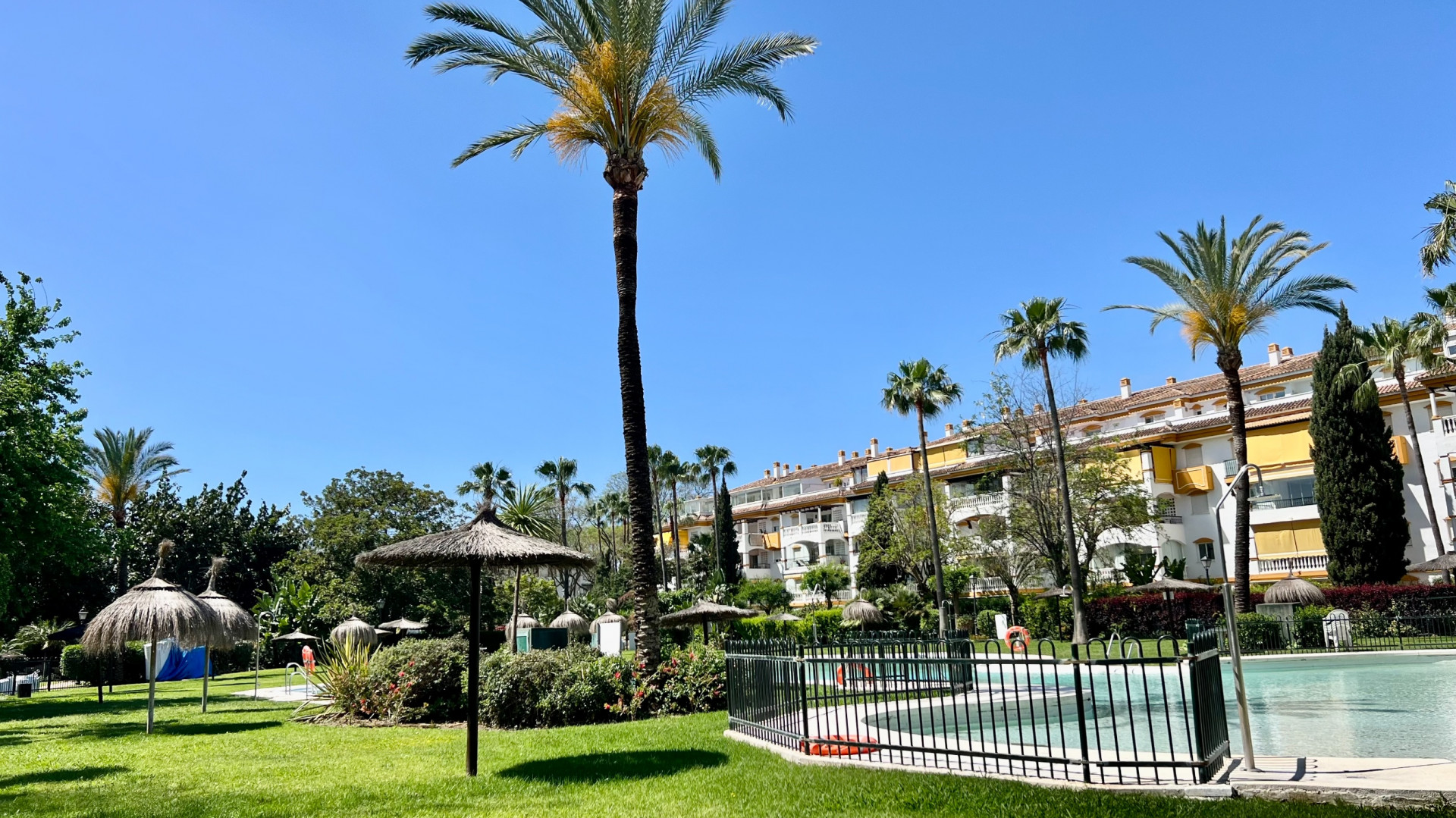 Located on the first floor, the apartment offers excellent privacy, open views of the gardens and pool, and a functional layout: