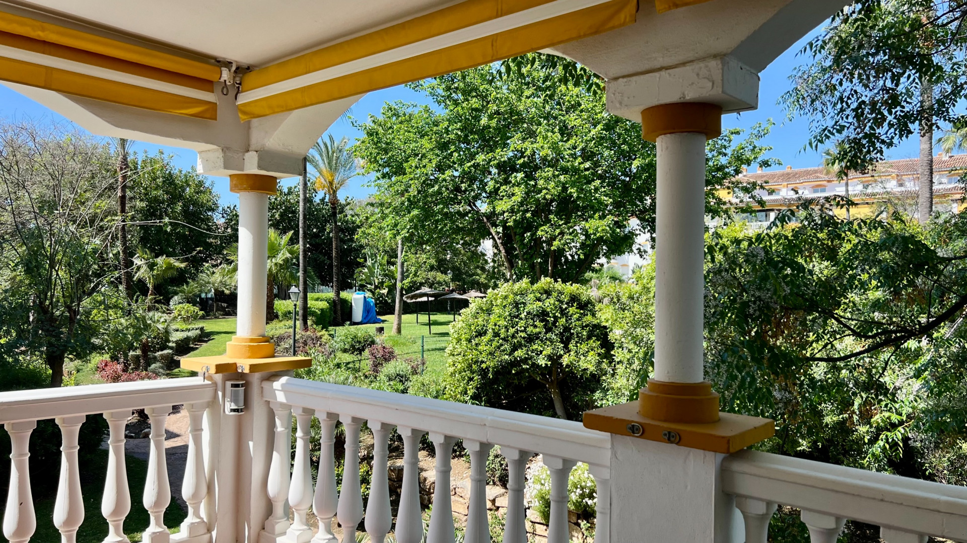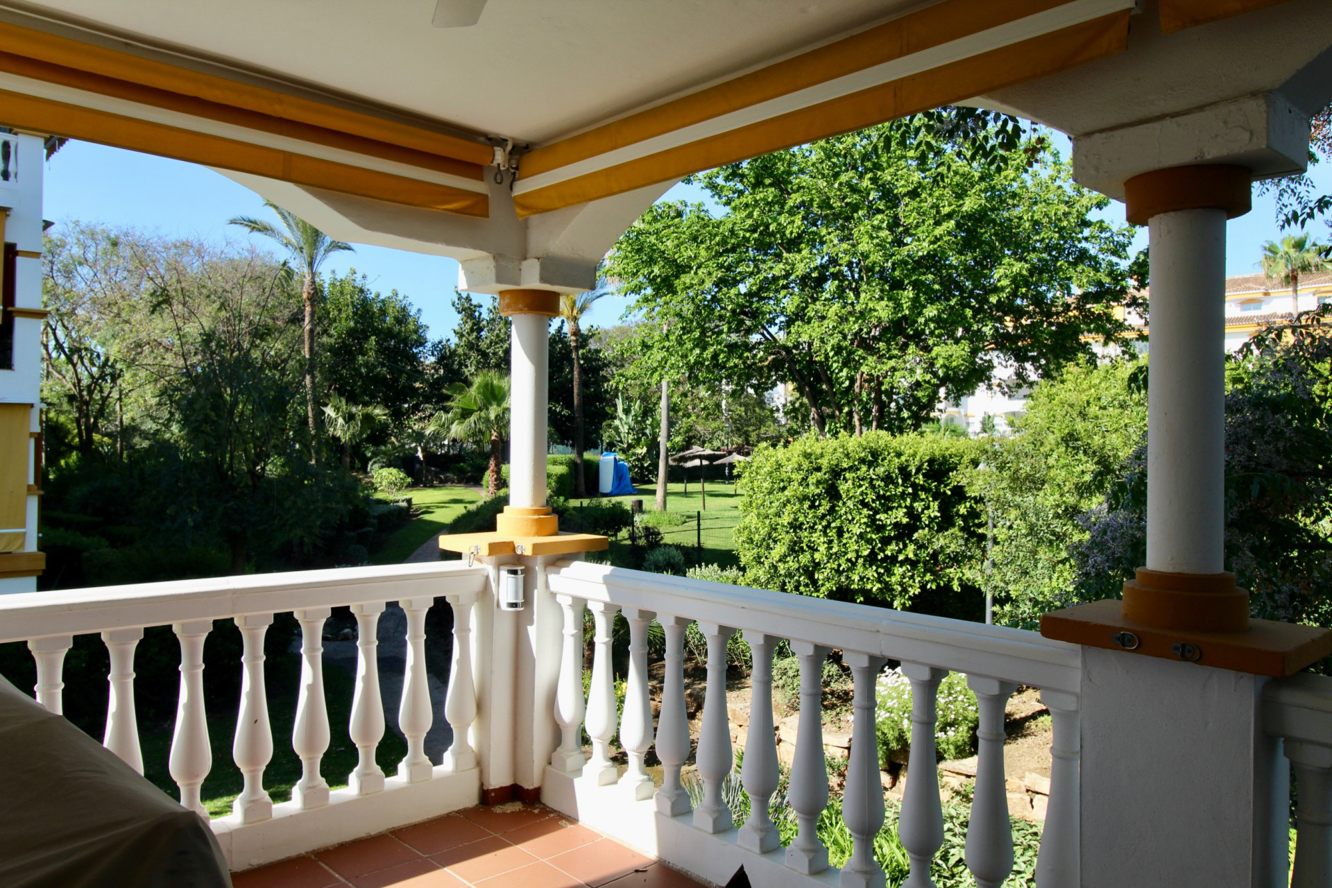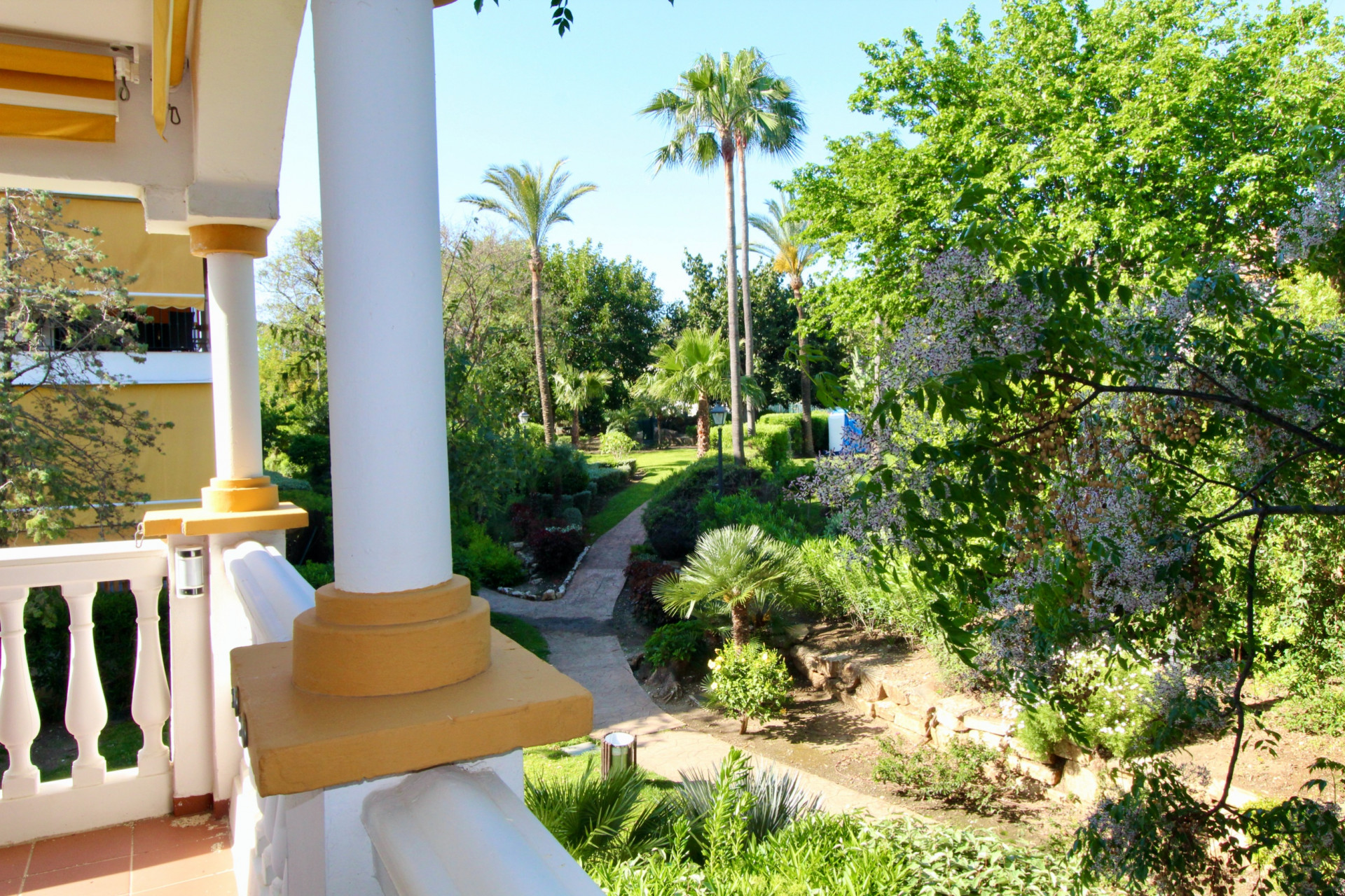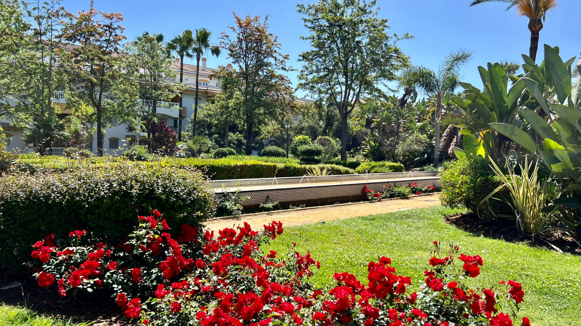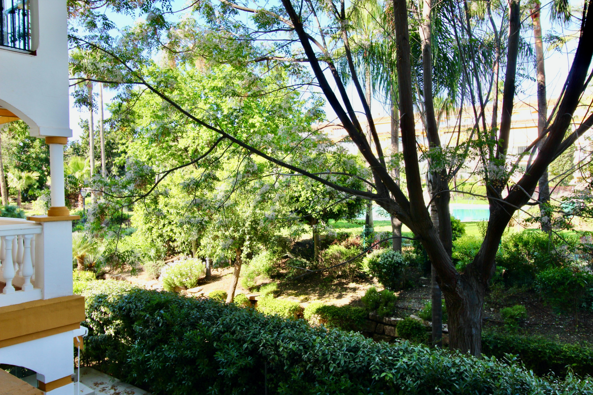 Located on the first floor, the apartment offers excellent privacy, open views of the gardens and pool, and a functional layout: