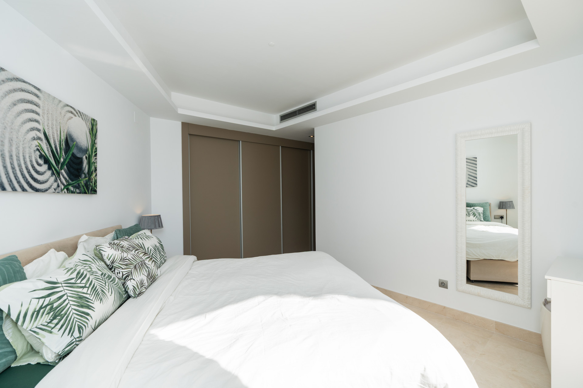 The primary suite serves as a peaceful retreat, featuring fitted wardrobes, a stylish en-suite bathroom, and direct access to the terrace where the beautiful Mediterranean views can also be enjoyed.