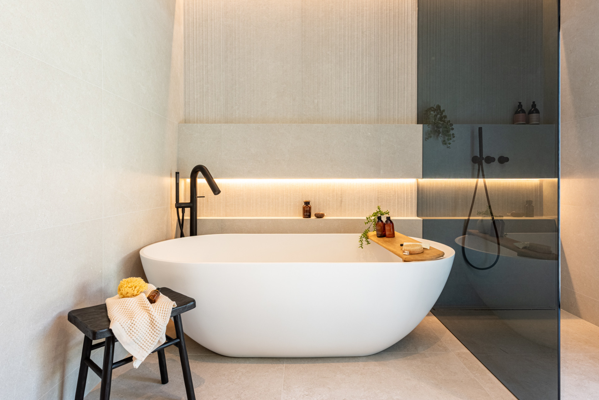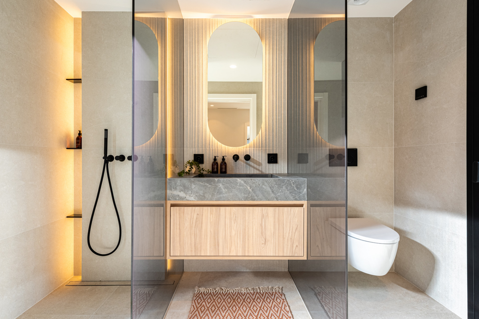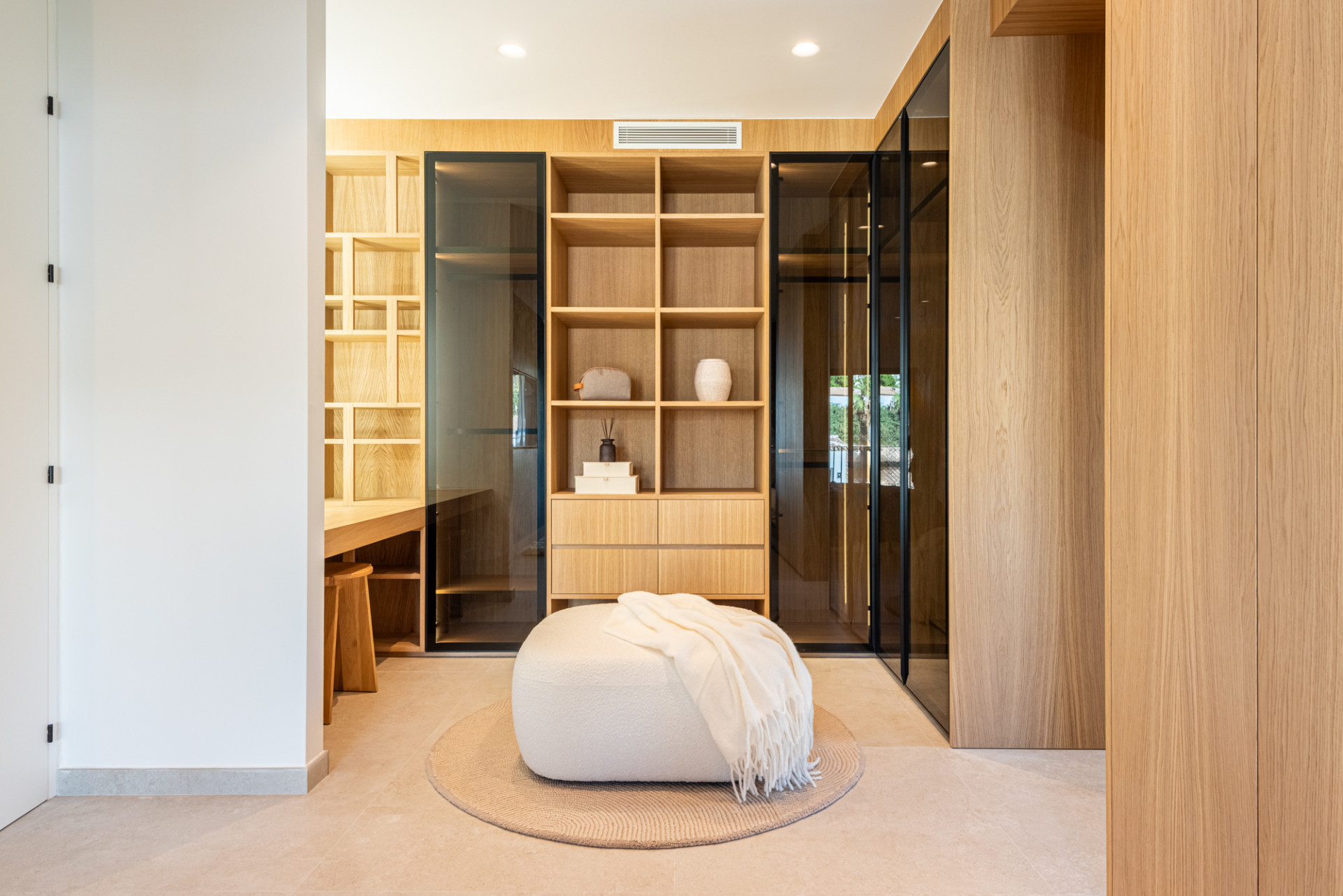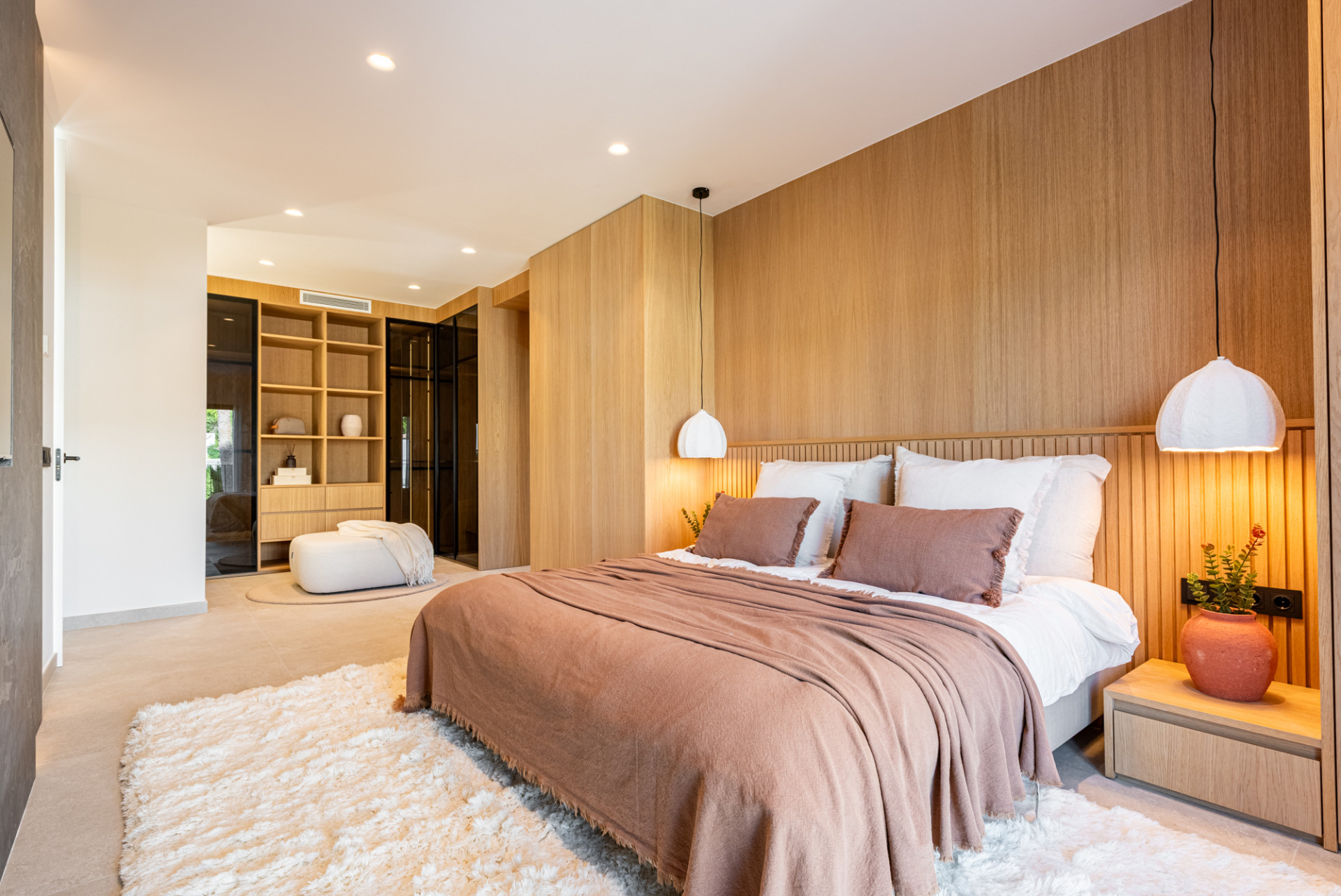 La villa ofrece cuatro dormitorios, todos con baño en suite, dando a cada familiar su propia zona de confort. Cada dormitorio está equipado con AC central individual (frío/calor) para el control climático personalizado. La suite principal incluye una zona de maquillaje, un amplio baño con ducha y bañera, y una vista privada de La Concha, un recordatorio sutil cada mañana de donde vives.