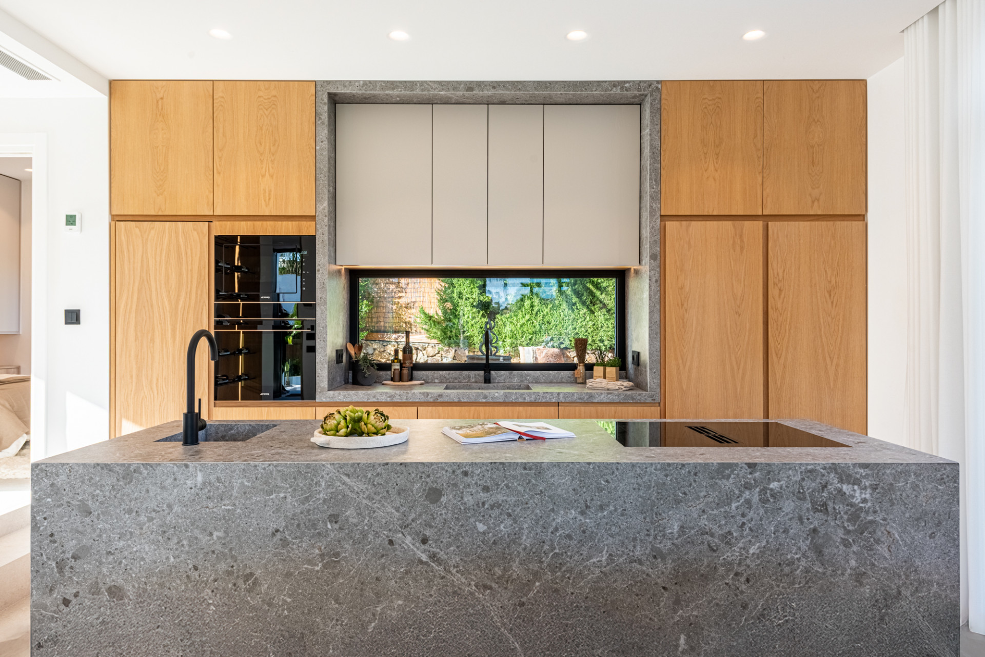 La planta principal se centra en un diseño abierto naturalmente social, donde la cocina, comedor y sala de estar conectan perfectamente. La cocina destaca con electrodomésticos Smeg, un estante de vino incorporado y un espacio de trabajo generoso, lo que lo convierte en el verdadero corazón de la casa. La zona de estar se siente luminosa y abierta durante todo el día gracias a su techo de doble altura, grandes puertas de vidrio hacia el jardín, y una elegante chimenea de etanol que añade calor y atmósfera sin comprometer el diseño limpio y moderno.
