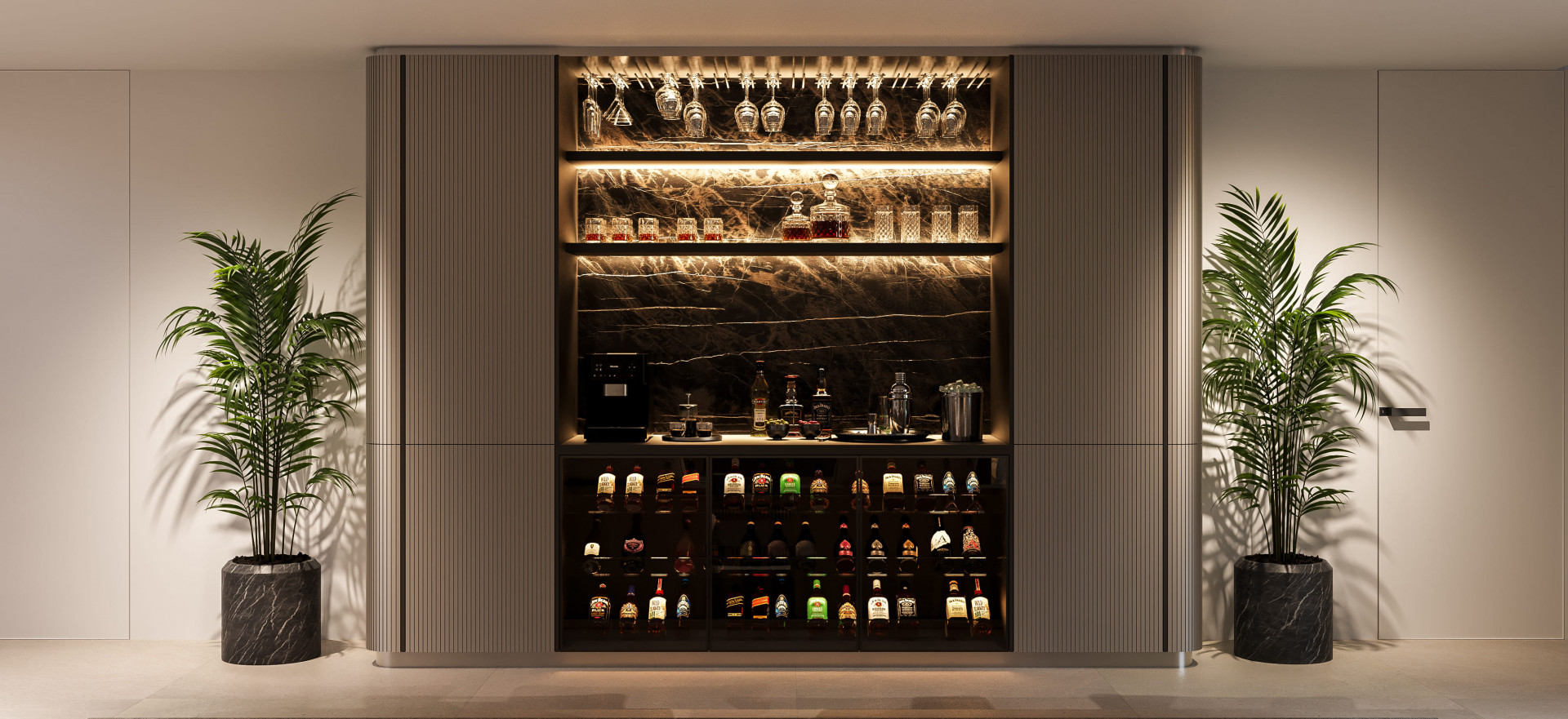 La vida al aire libre es igualmente impresionante, con amplias terrazas, una pérgola con aperturas regulables y una piscina privada rodeada de exuberantes jardines mediterráneos. La villa también incluye un gimnasio completamente equipado, un elegante bar con zona de estar y un sótano versátil diseñado para diferentes usos.