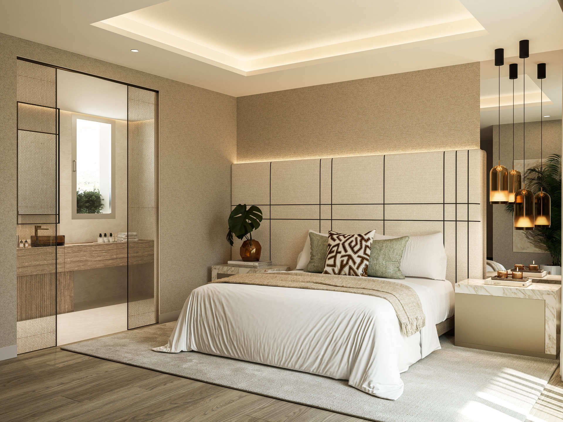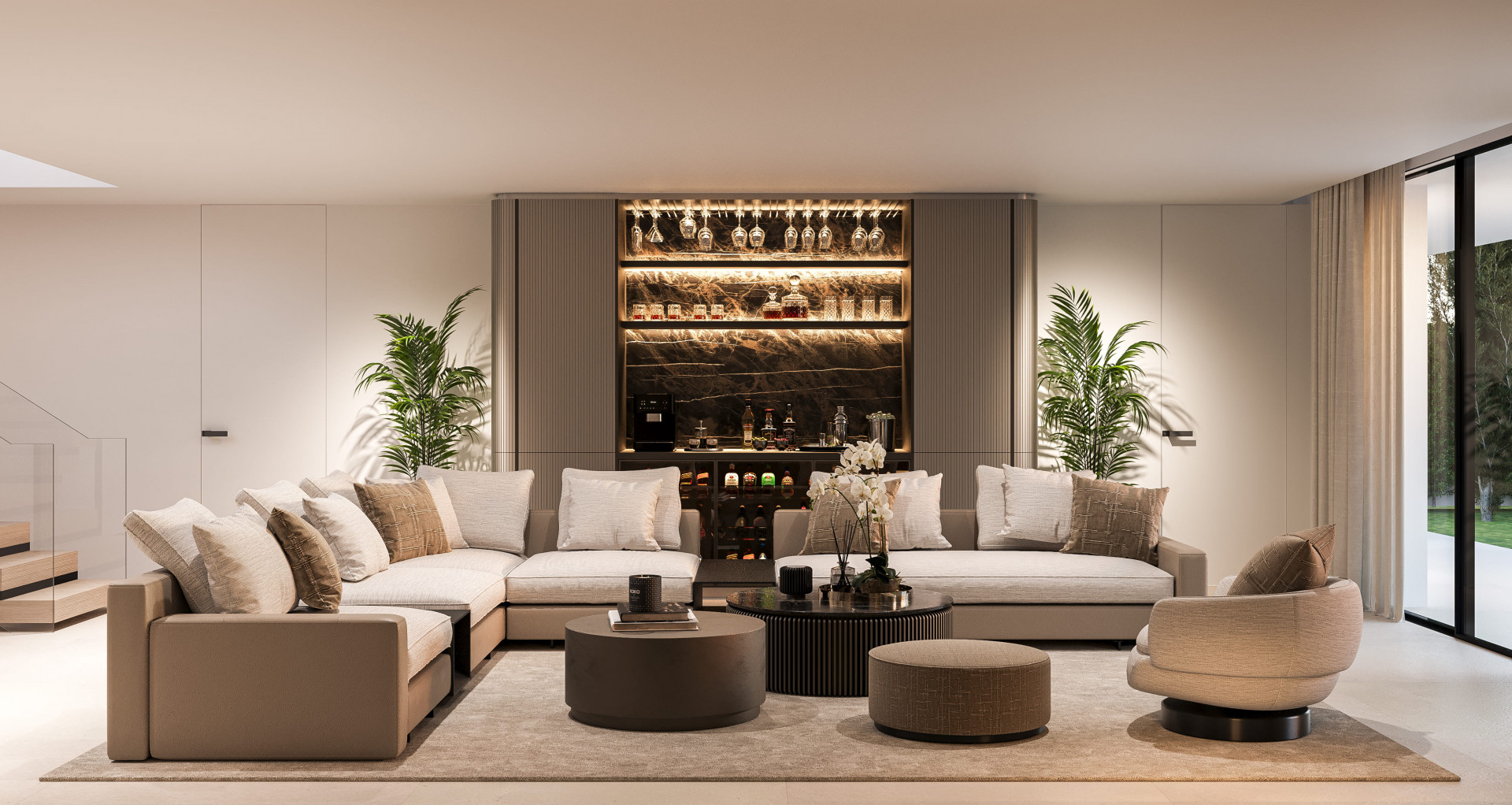 Diseñada por los reconocidos arquitectos Jesús Estepa Rubio y Antonio Estepa Rubio de ER Arquitectos, y decorada por AALTO Exclusive Design, la villa presenta una fusión armoniosa de piedra natural, elegantes elementos de cristal y líneas arquitectónicas limpias. Las zonas de salón y comedor de concepto abierto reciben abundante luz natural gracias a los ventanales de suelo a techo que enmarcan las espectaculares vistas del entorno.