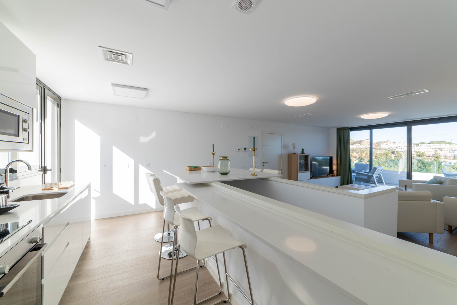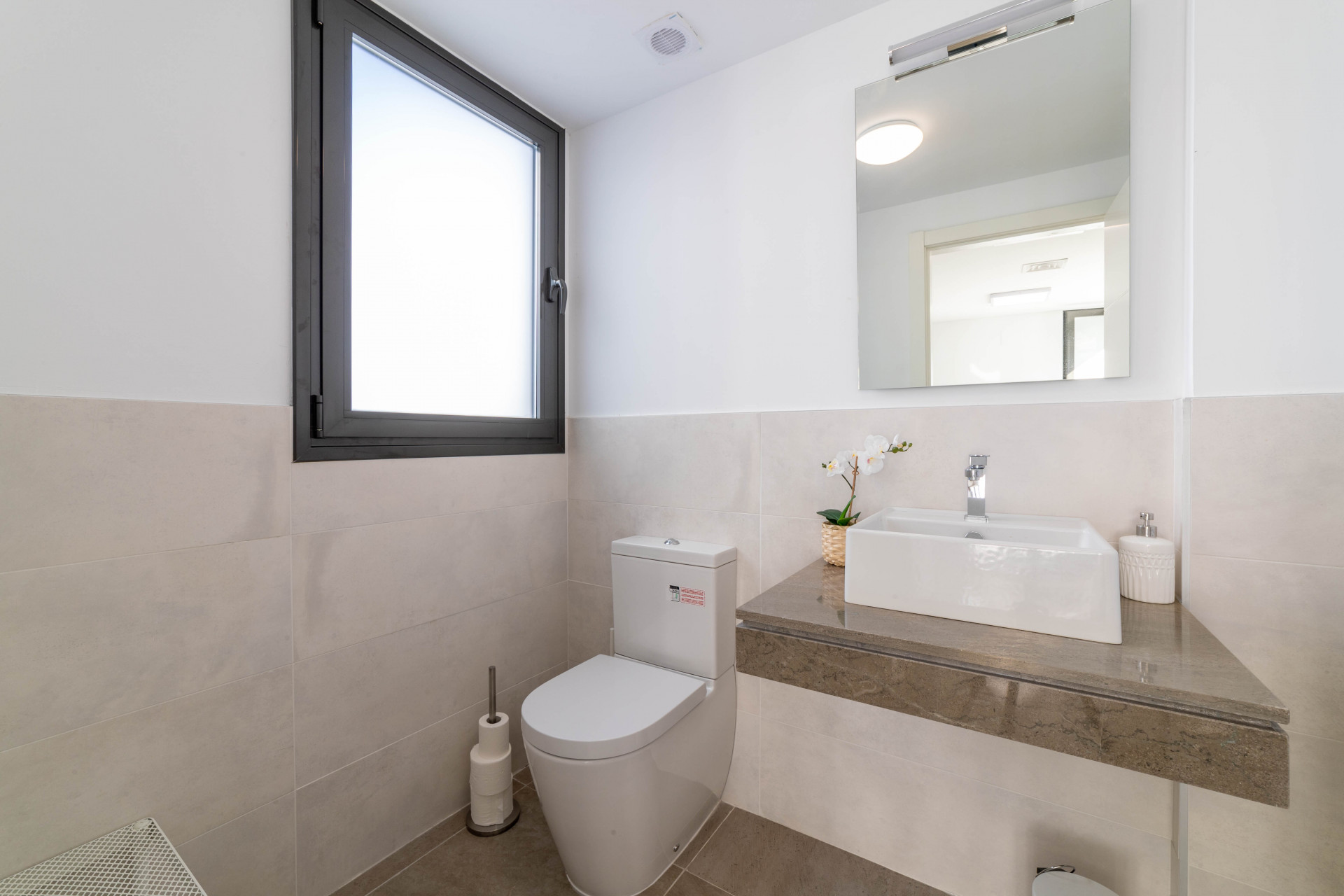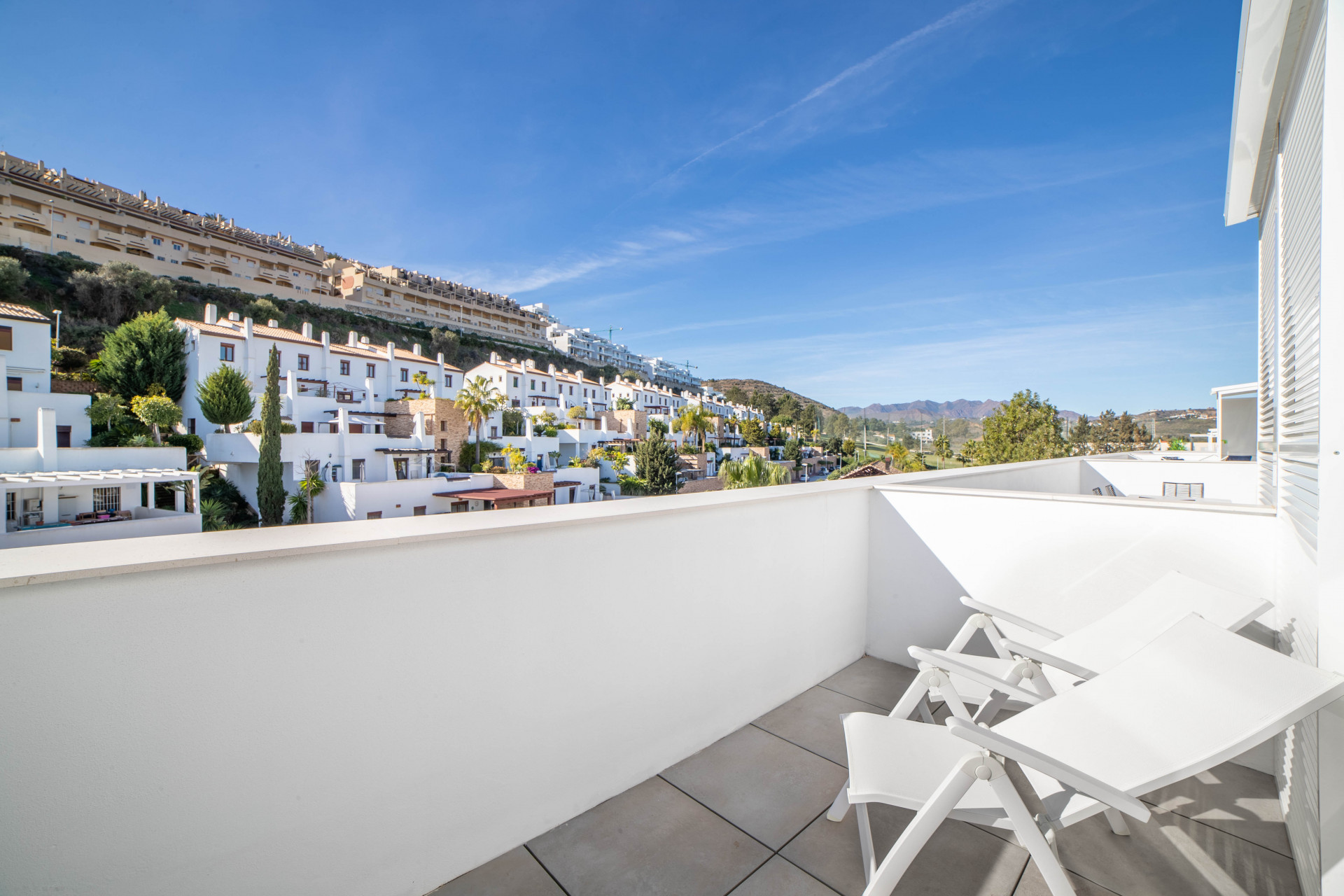 On the upper floor, where the entrance is located, you’ll find a bright and spacious living room with an open-plan kitchen, a guest toilet, and two large terraces—one on each side of the apartment. One terrace enjoys lovely views over the golf course, while the other overlooks the charming communal areas of the urbanization.