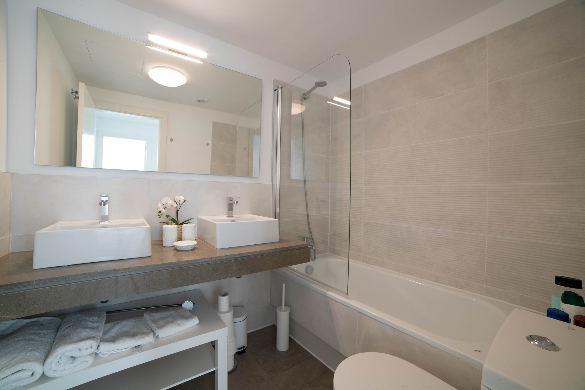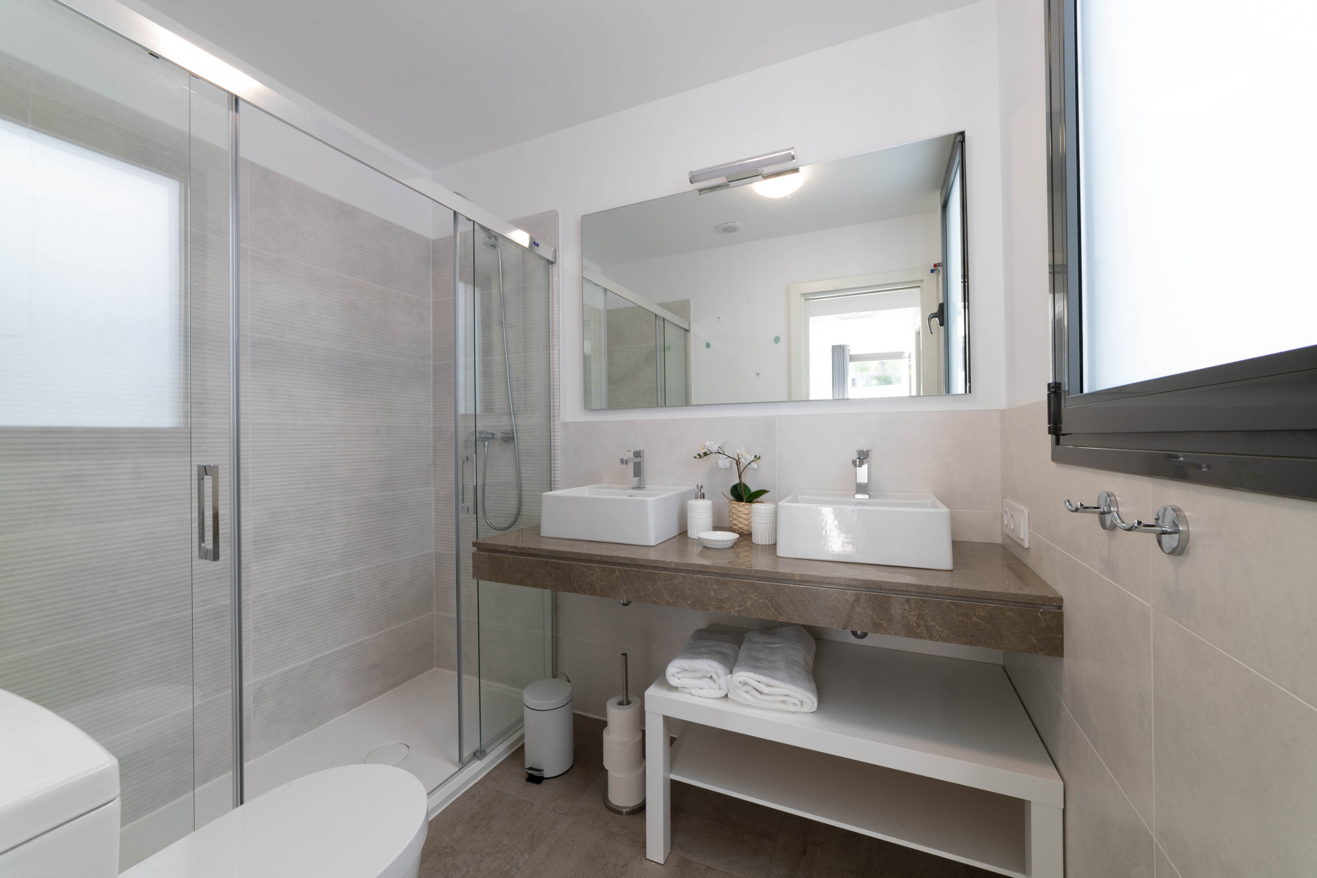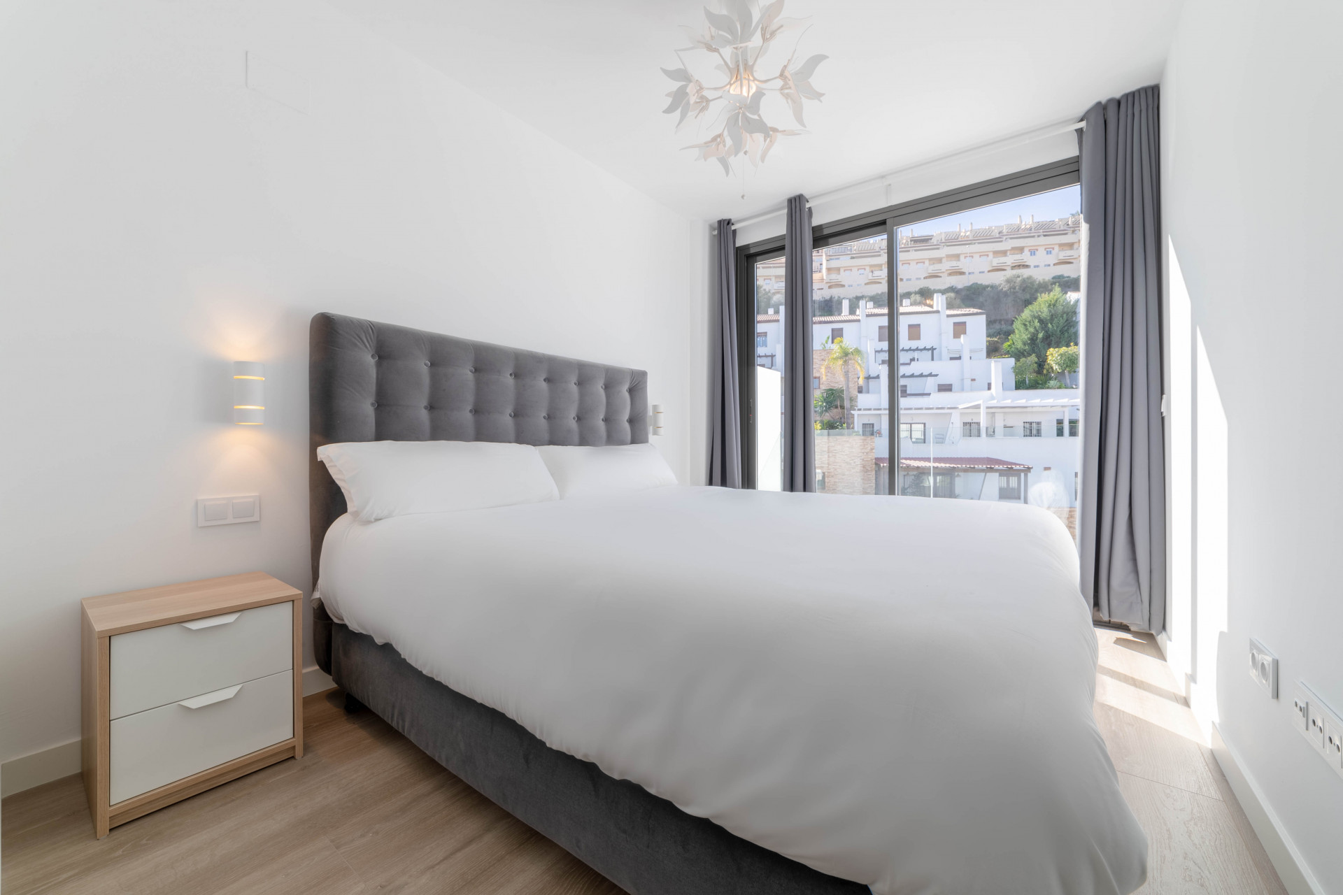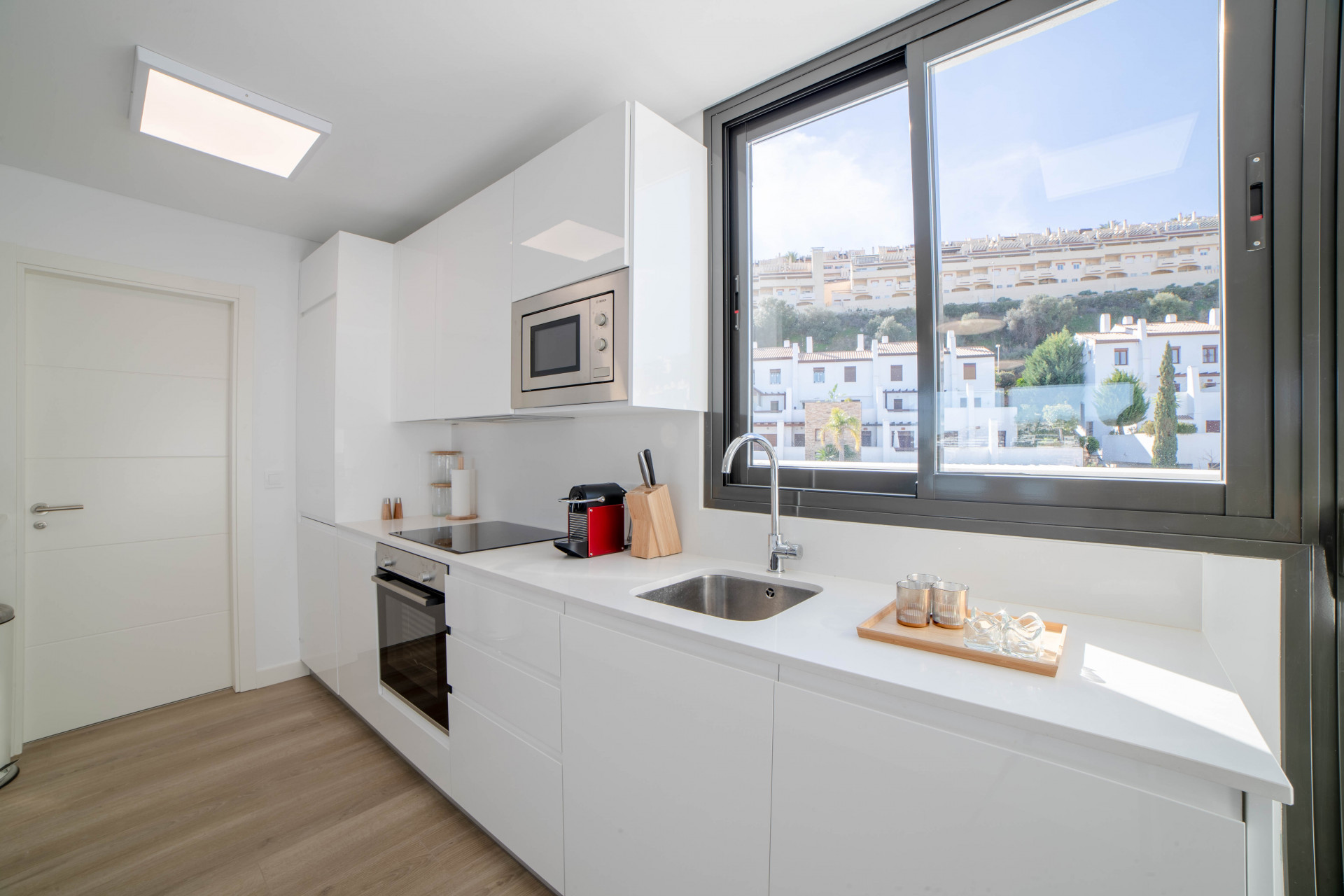 On the upper floor, where the entrance is located, you’ll find a bright and spacious living room with an open-plan kitchen, a guest toilet, and two large terraces—one on each side of the apartment. One terrace enjoys lovely views over the golf course, while the other overlooks the charming communal areas of the urbanization.