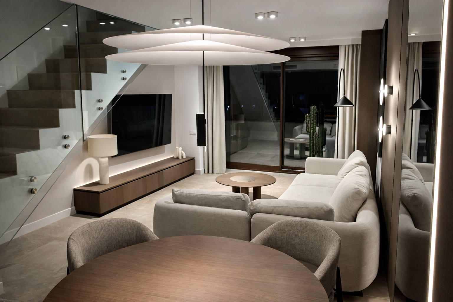 Floor-to-ceiling windows seamlessly connect the interior with expansive terraces, creating a natural extension of the living space.