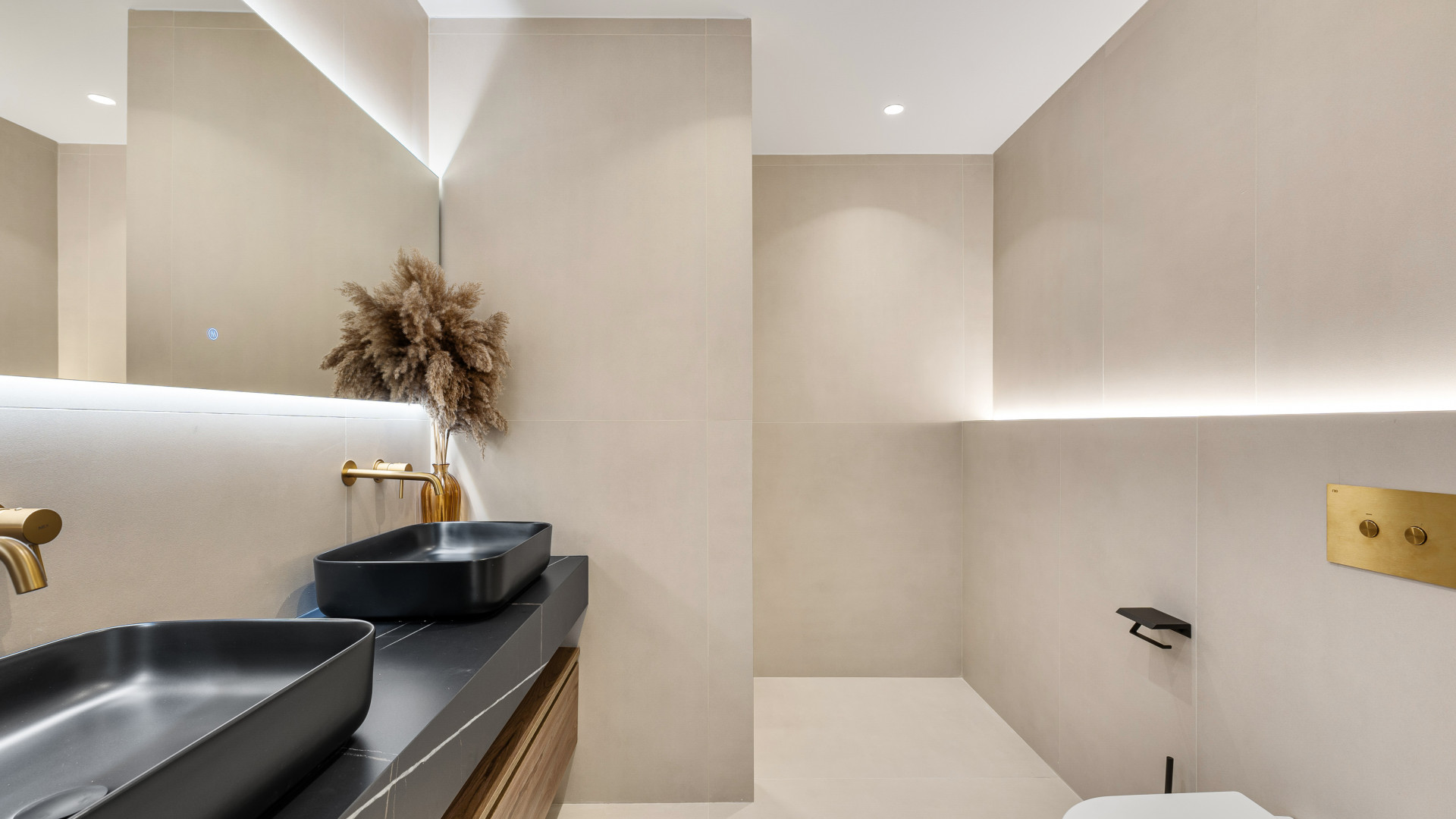 Spread over two levels, the home offers 163 square meters of thoughtfully designed living space and 49 square meters of terraces. It features three spacious bedrooms, each with its own en-suite bathroom, plus an additional guest bathroom. The ground floor offers an open-plan layout that connects the kitchen, dining, and living areas, flowing seamlessly out to a private garden terrace, perfect for relaxed indoor-outdoor living.