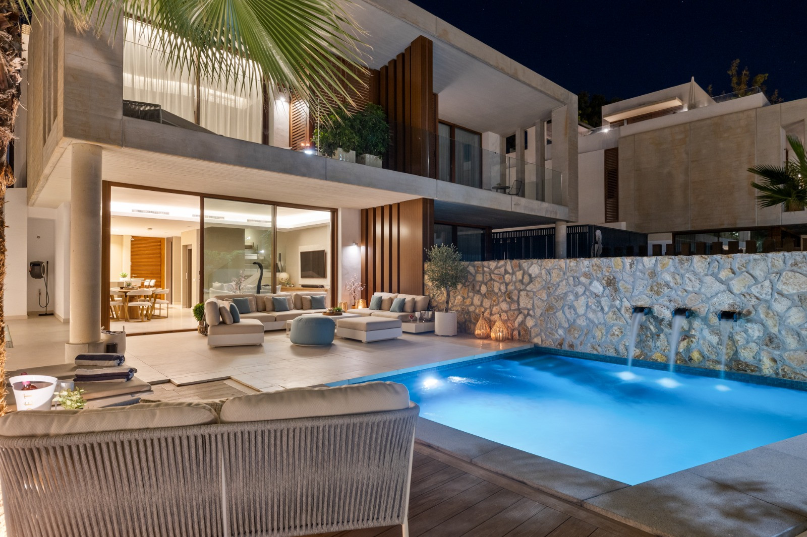 The villa features four spacious bedrooms, bright open-plan living areas, and a fully equipped modern kitchen. Large glass doors connect the interior seamlessly with the private garden and swimming pool, creating the perfect indoor-outdoor flow.