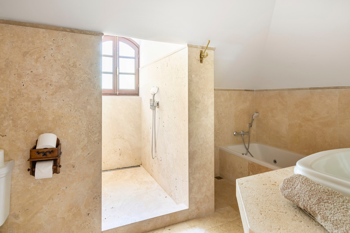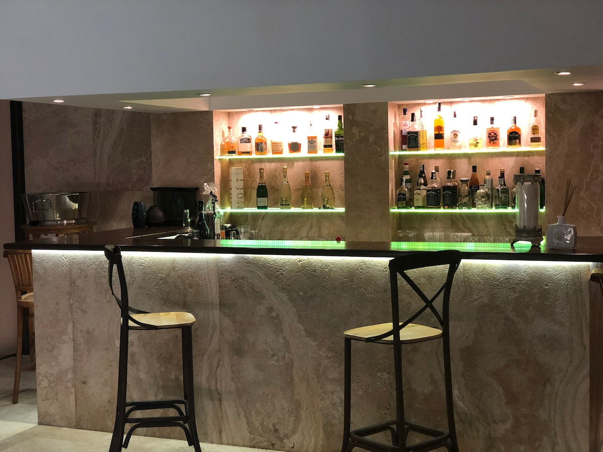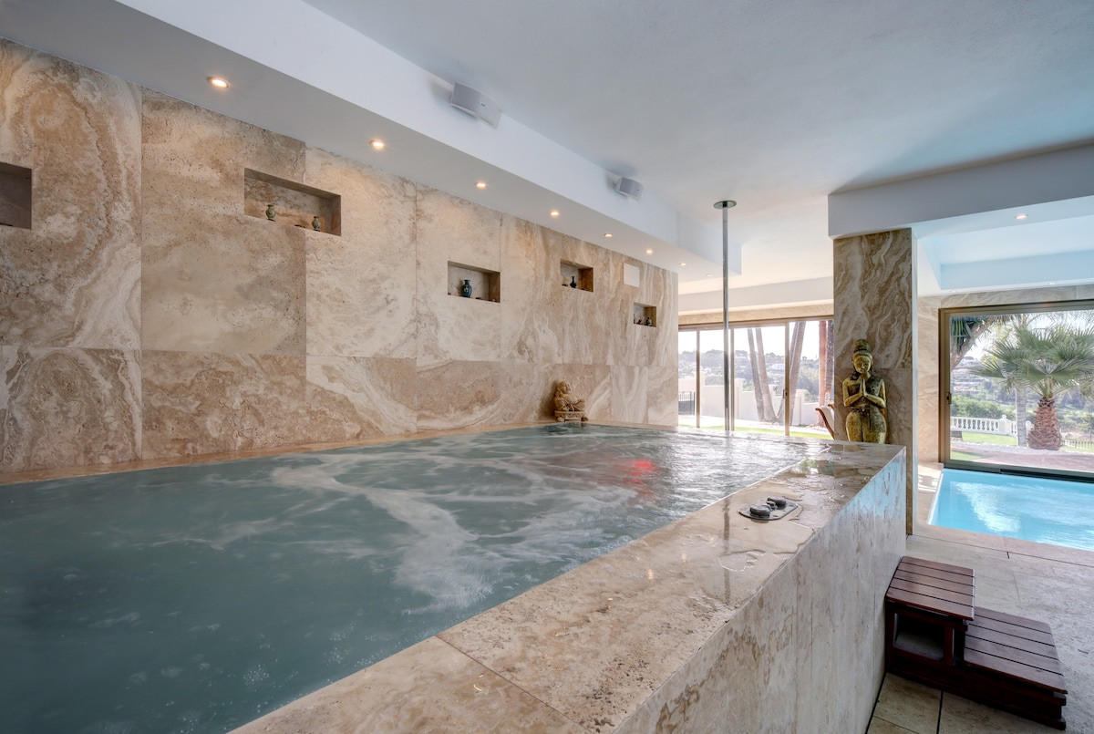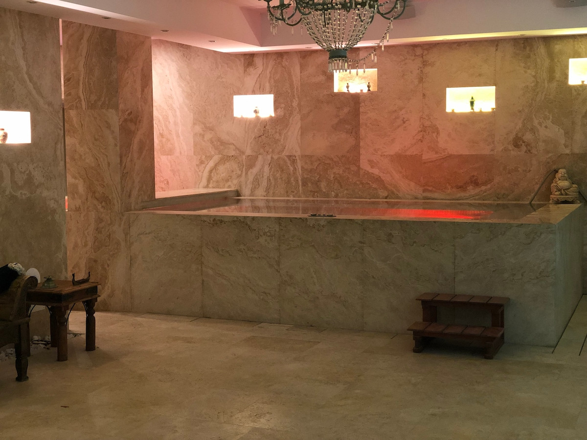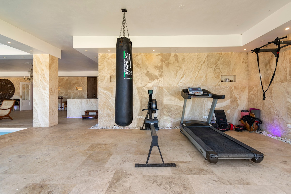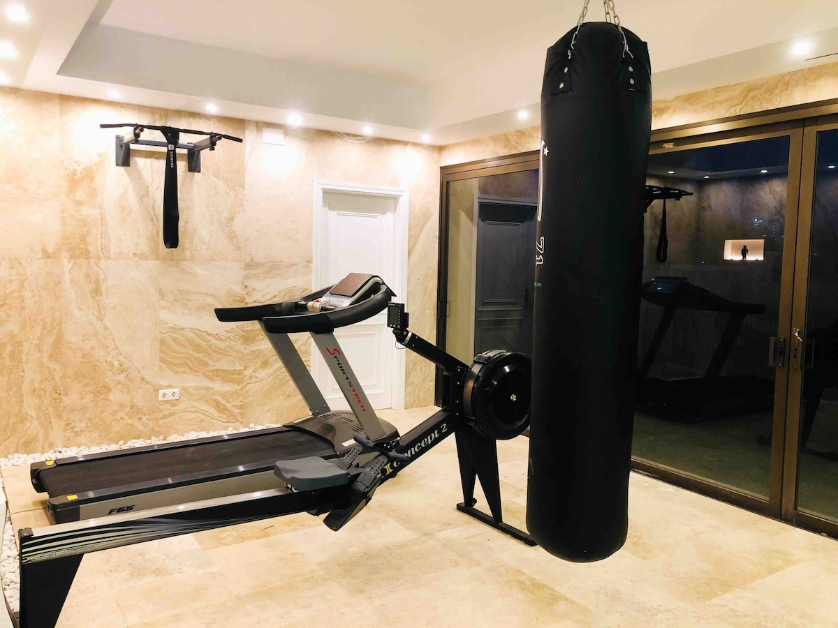 A private gym, outdoor pool, heated indoor pool, sauna, Turkish bath, cold plunge pool, and barbecue areas for outdoor gatherings are available.