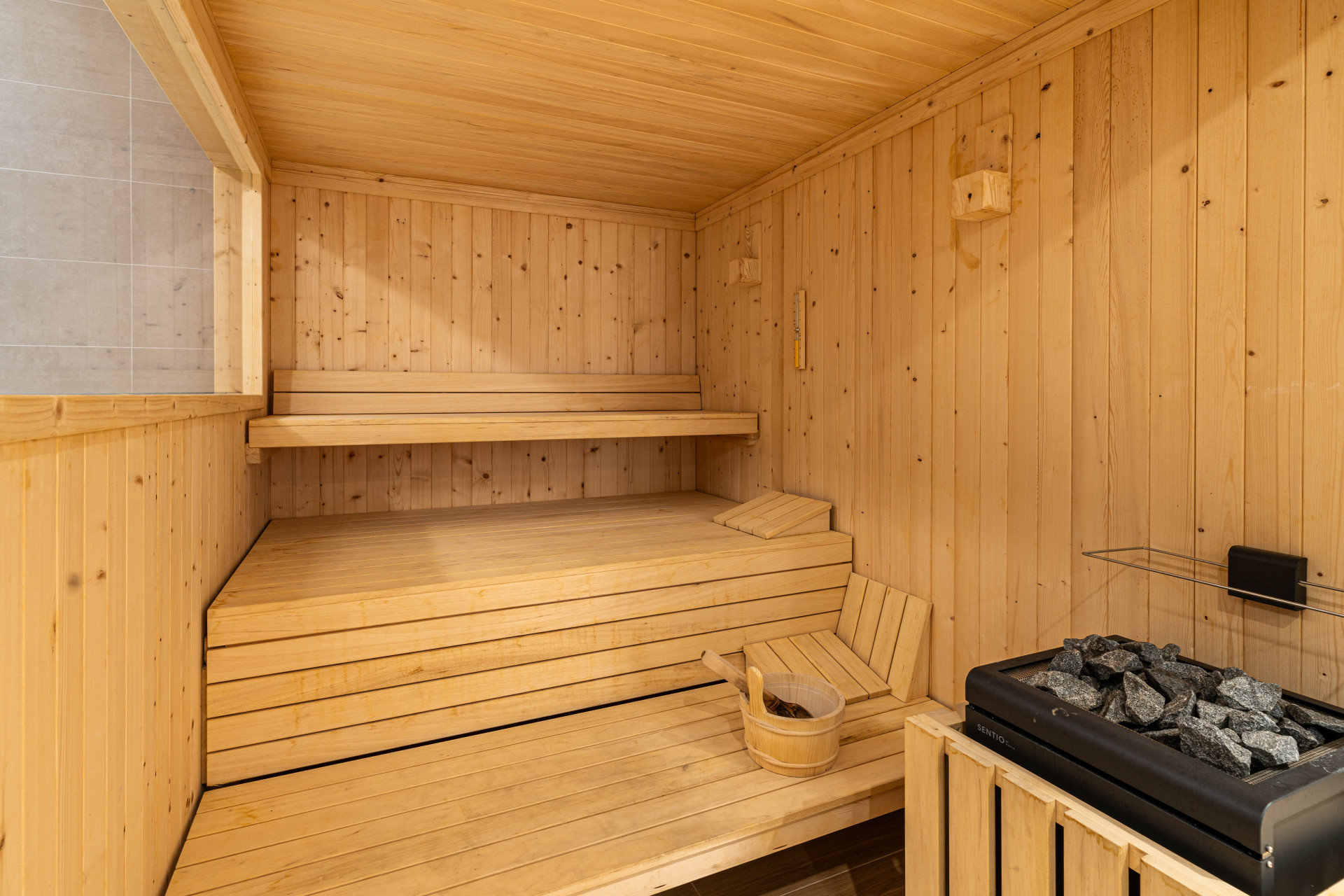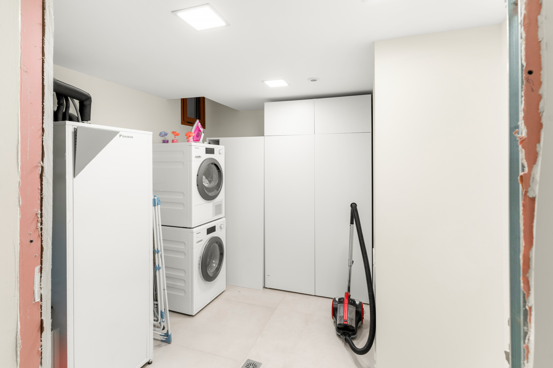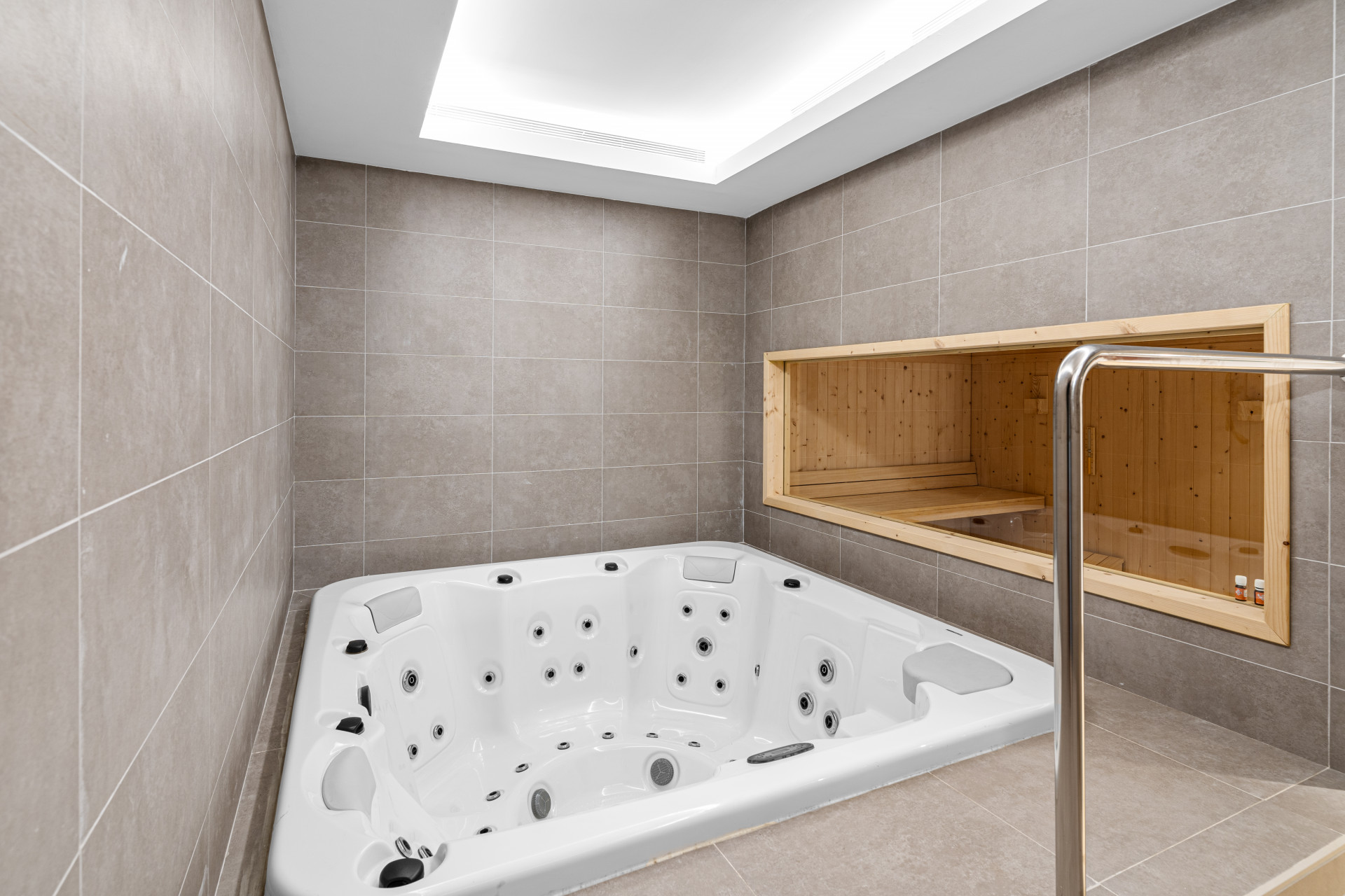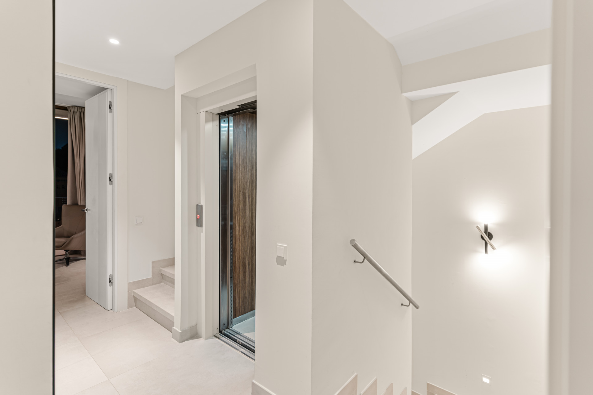 For ultimate convenience. The villa features a private elevator connecting all four levels, from the spacious double parking garage to the rooftop terrace, ensuring effortless movement throughout the home The exclusive community amenities include a saltwater pool and sauna, elevating the luxury lifestyle
