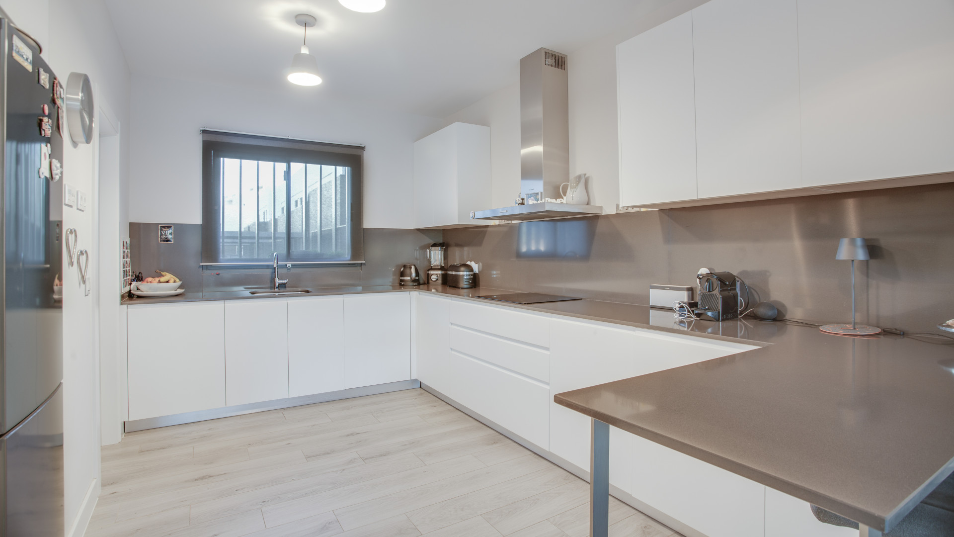 This modern townhouse in excellent condition combines contemporary architecture with a functional layout across three levels. The open-plan living area leads directly to a west-facing terrace and private garden, offering stunning views over the golf course. The fully equipped kitchen, designed in elegant grey and white tones, features branded appliances and an adjacent utility room. The upper floor includes three bedrooms, among them a master suite with en-suite bathroom and balcony. A separate studio with its own bathroom and a spacious rooftop terrace with far-reaching sea views complete the living space. The gated community offers a well-maintained communal pool, fitness area with sauna, and convenient access to numerous golf courses, beaches, and shopping facilities. Ideally suited for buyers seeking modern comforts, tranquillity, and proximity to leisure options.
