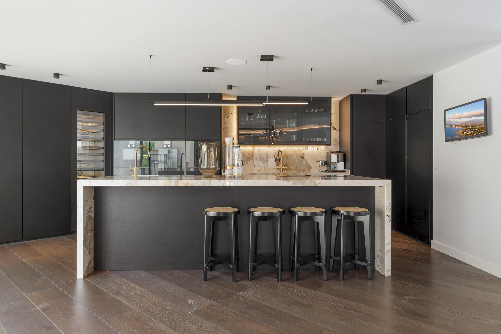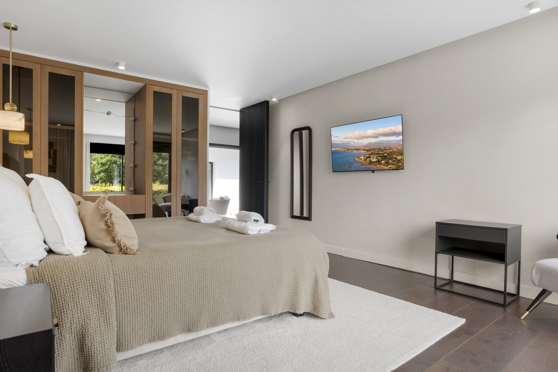 Designed for both grand entertaining and serene everyday living, the villa showcases expansive, light-filled interiors with soaring ceilings and fluid open spaces. The main floor features a stunning living area with a statement fireplace, seamlessly connected to a formal dining room and a state of the art Gaggenau kitchen. Floor-to-ceiling doors invite the outdoors in, opening to a private oasis with manicured gardens, a sparkling pool, jacuzzi, and an al fresco kitchen, perfect for hosting unforgettable gatherings or enjoying quiet moments in complete privacy.