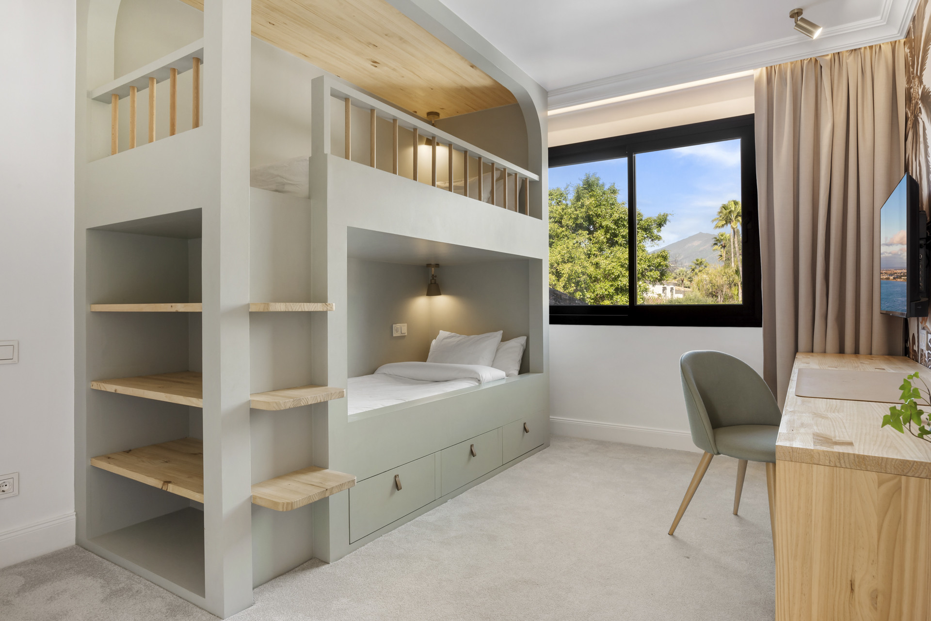 The entrance level boasts two bedrooms with en-suite bathrooms, a modern fully equipped kitchen, a spacious living room, and a dining area. On the upper floor, you’ll find two additional bedrooms sharing a bathroom, along with the luxurious master suite featuring a private en-suite bathroom. At the top of the house, a large bedroom opens up to a tastefully decorated terrace, offering breathtaking views.