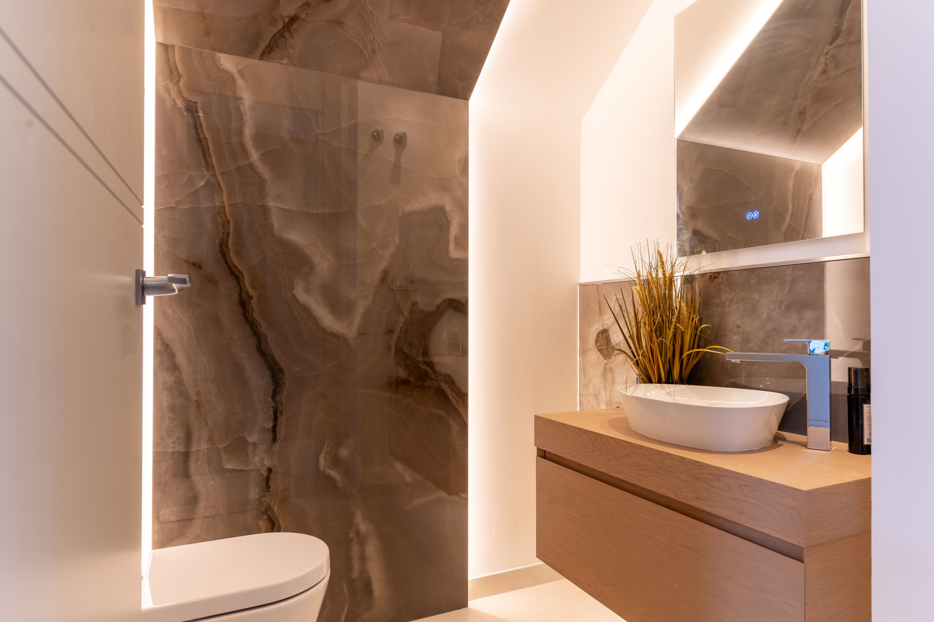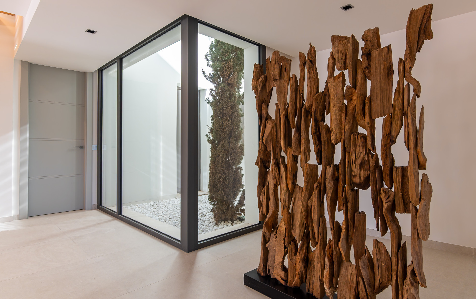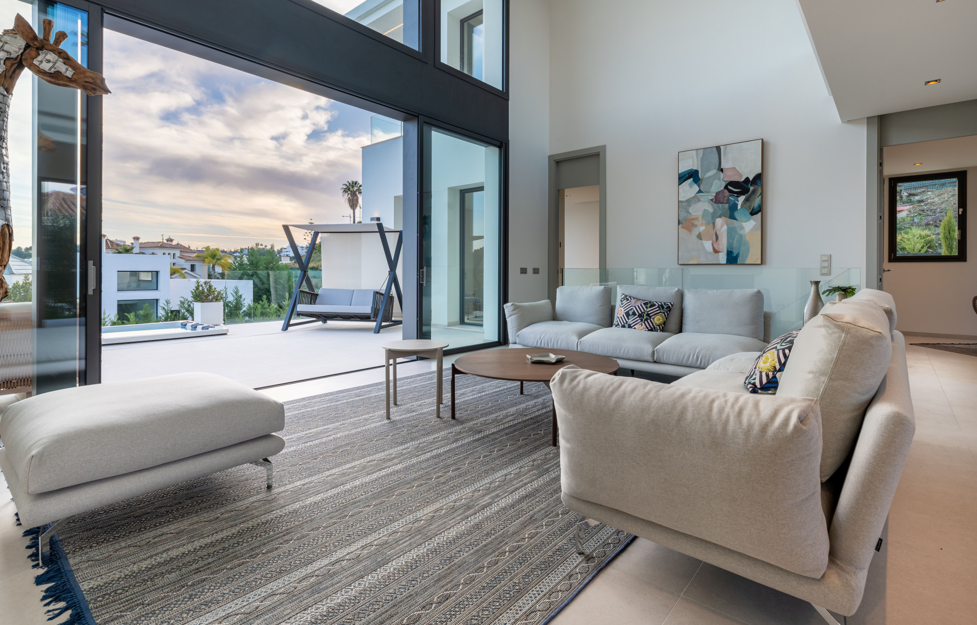 Up the wide timber stairs, you enter an open gallery area that connects the light-filled upper floor with the panoramic surroundings, perfect for an open-plan office or indoor chillout area. The main suite also enjoys panoramic views, a spacious ensuite bathroom and a secret balcony that overlooks the entrance and main lounge area. This level also offers two further bedroom suites all with private bathrooms, terraces and stunning views - perfect for a family or customised living quarters.