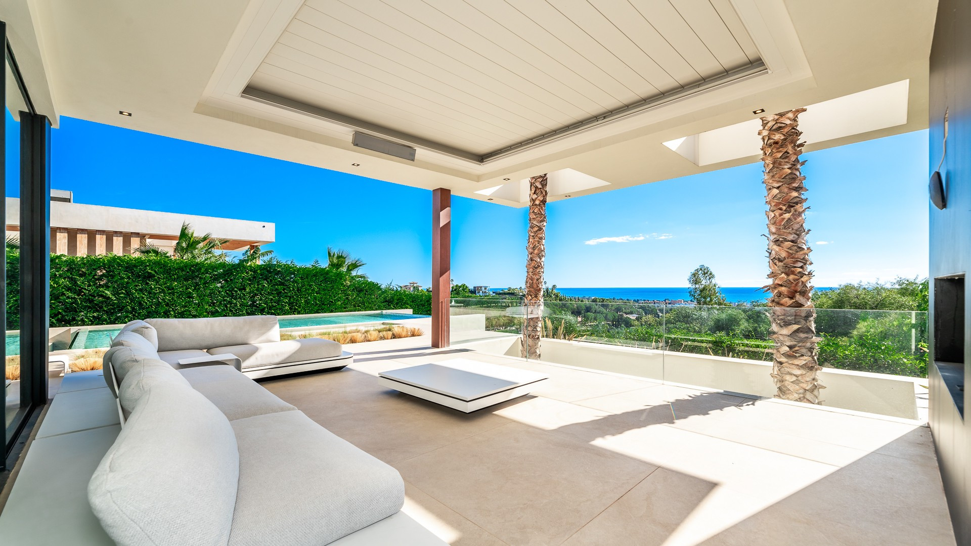 Outside, the villa boasts a stunning infinity pool, chill-out area with a fireplace, and beautifully designed terraces, perfect for entertaining or relaxing while enjoying the panoramic sea views.