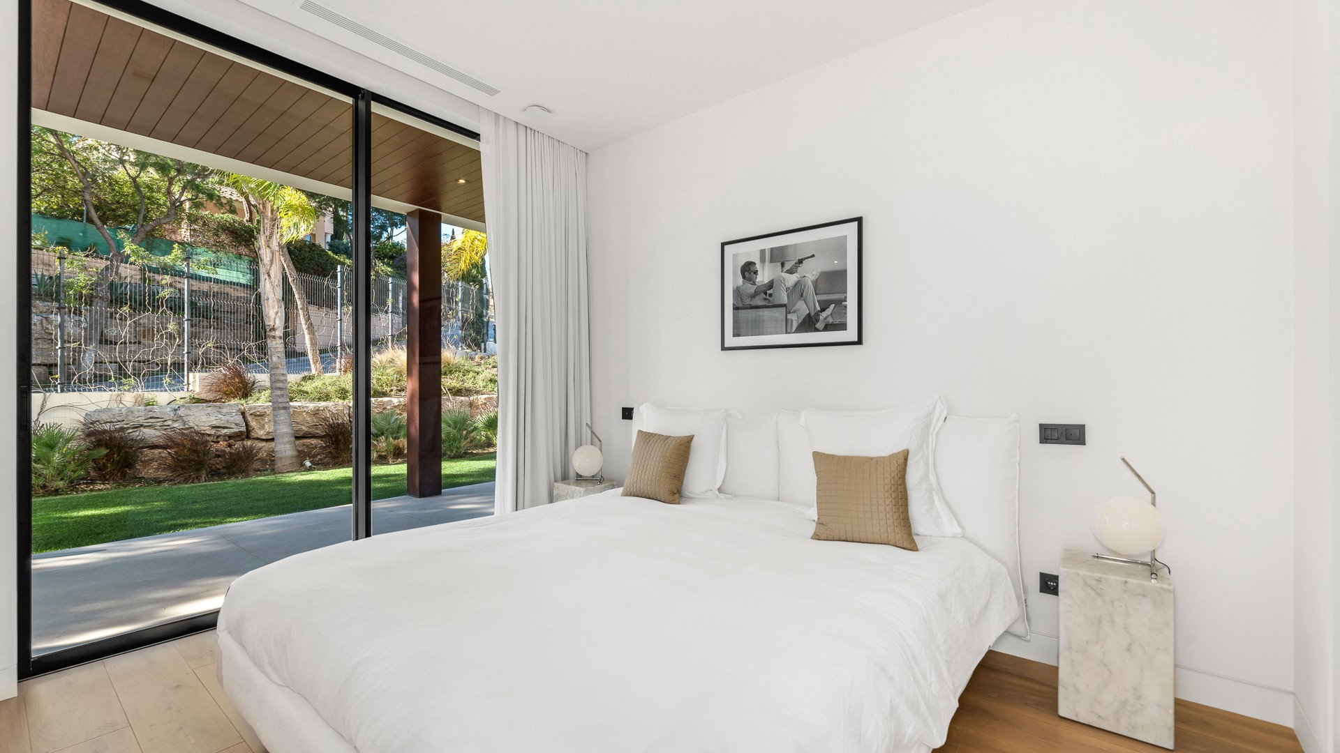The five spacious bedrooms, including three with access to a large first-floor terrace, provide exceptional comfort, while the six luxurious bathrooms enhance the villa's elegance. On the lower ground floor, a gym and a cinema room add to the villa’s amenities.
