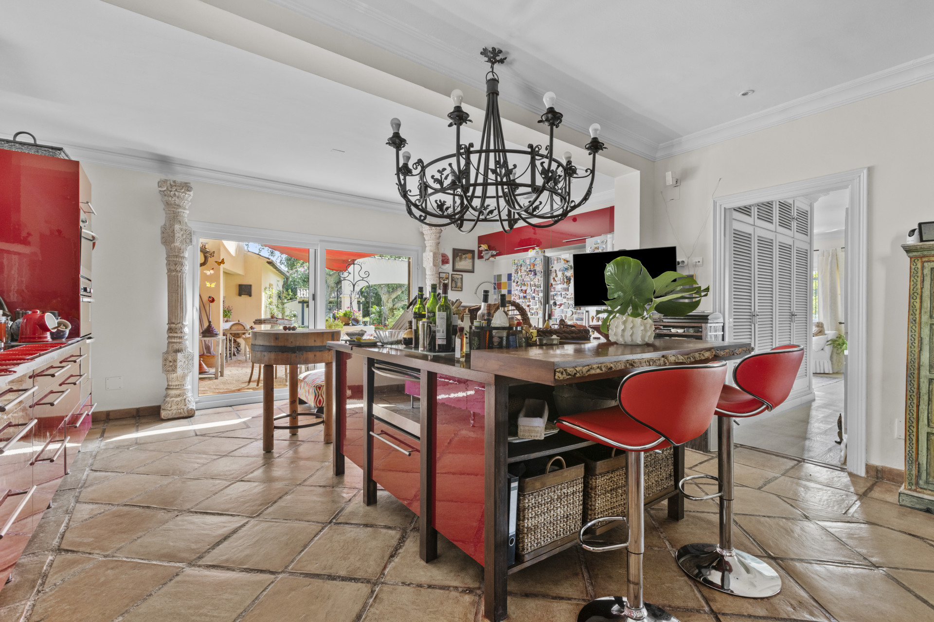 The main house offers elegance, warmth and generous interior spaces. The bright living room opens directly onto a south-facing covered terrace, overlooking the stunning gardens. The large country-style kitchen, with central island and oversized dining table, connects to a spacious wine cellar and a fully equipped secondary kitchen.